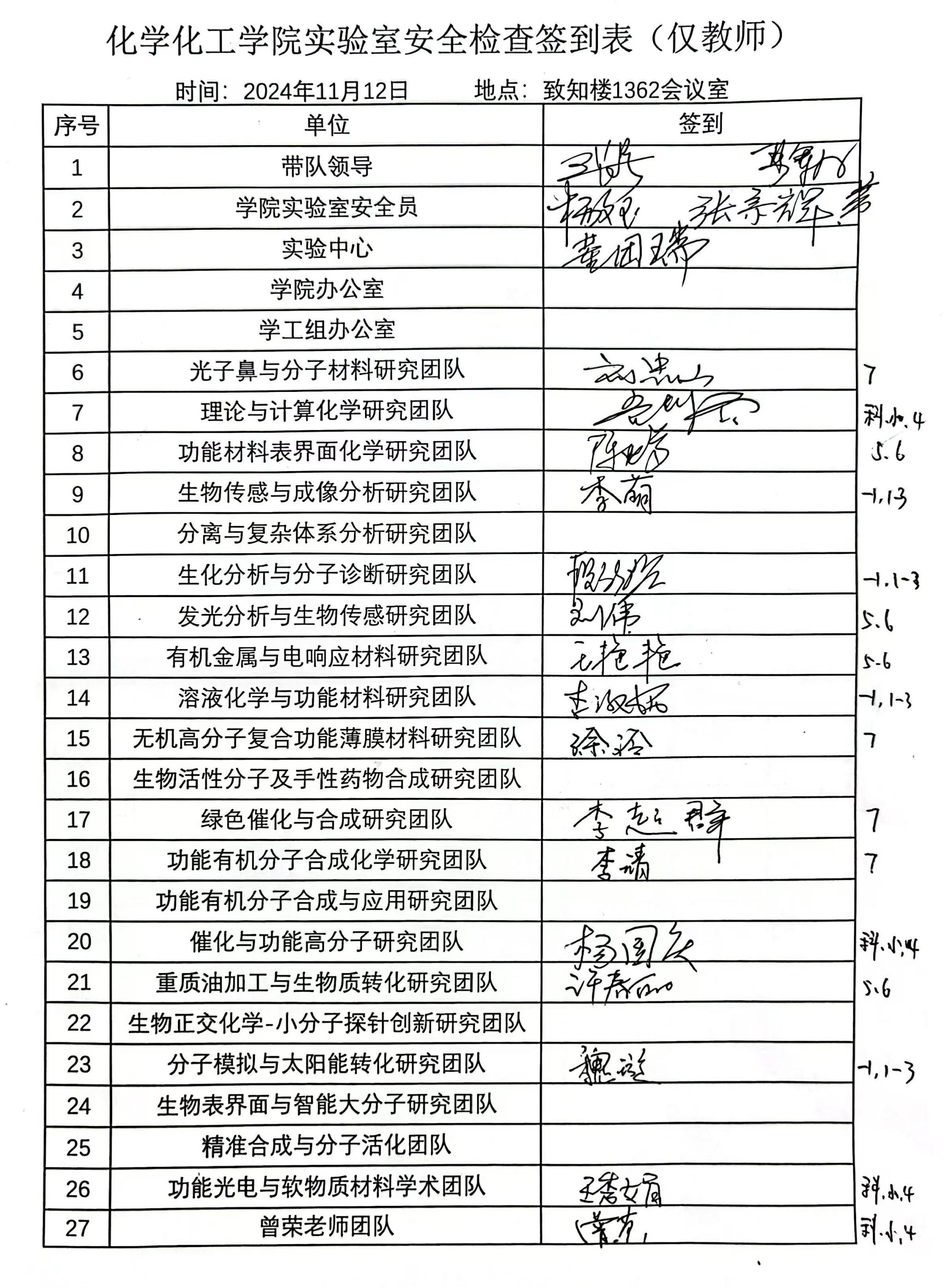 1112日下午,学院组织进行了消防安全月实验室安全检查工作,此次检查以消防安全为重点内容。学院副院长王长号、应用表面与胶体化学教育部重点实验室副主任严军林、安全工作委员会副主任杨文玉、各科研团队教师代表和学生代表约30余人参加。王长号通报了楼层内消防缓冲区的改造情况,详细介绍了本次检查的内容和要求。严军林强调对科研助理和联培学生需要实验室安全培训,以保证所有进入实验室的人员具有安全意识和防护举措。杨文玉将日常安全检查的整体情况进行了反馈并提出改进意见。随后,各检查小组分别对致知楼、化工楼小三层、科研大楼的科研实验室、教学实验室、公共区域逐一进行检查。