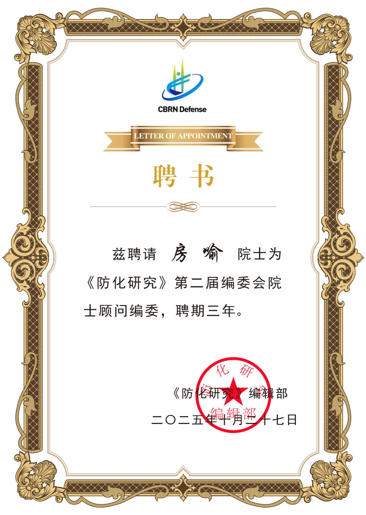 房喻院士受聘为《防化研究》第二届编委会院士顾问编委