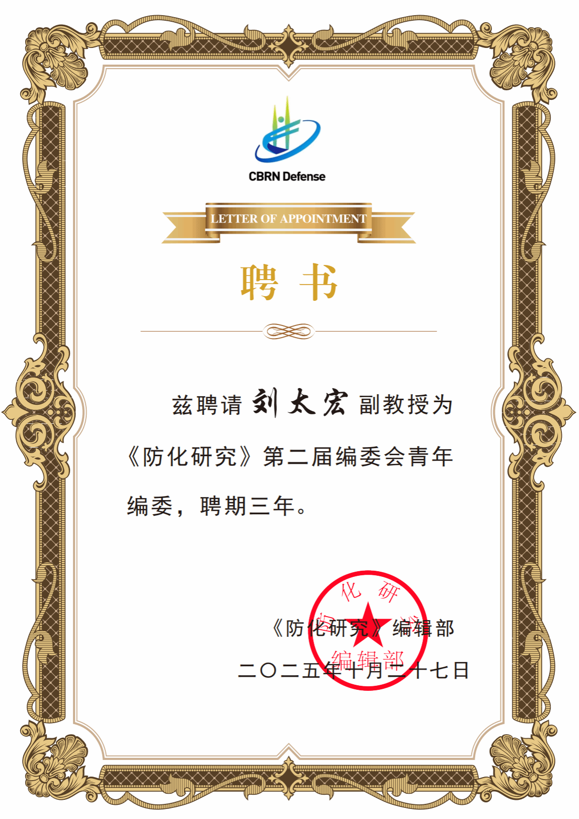 近期,《防化研究》第二届编委会成立大会在线举行,会上房喻院士受聘为第二届编委会院士顾问编委,刘太宏副教授受聘为第二届编委会青年编委,聘期三年。