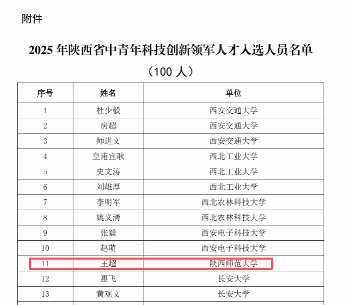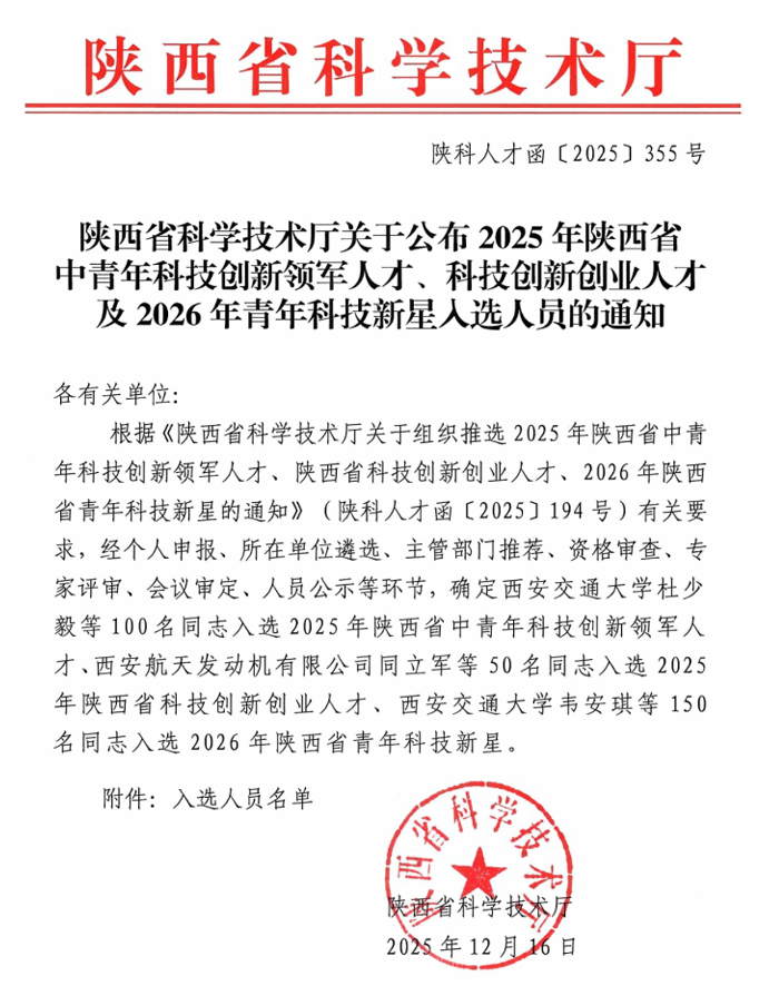 12月16日,陕西省科学技术厅公布了2025年度“陕西省中青年科技创新领军人才”入选人员名单。经个人申报、所在单位遴选、主管部门推荐、资格审查、专家评审、会议审定、人员公示等环节,英国365集团公司王超教授入选该项目。