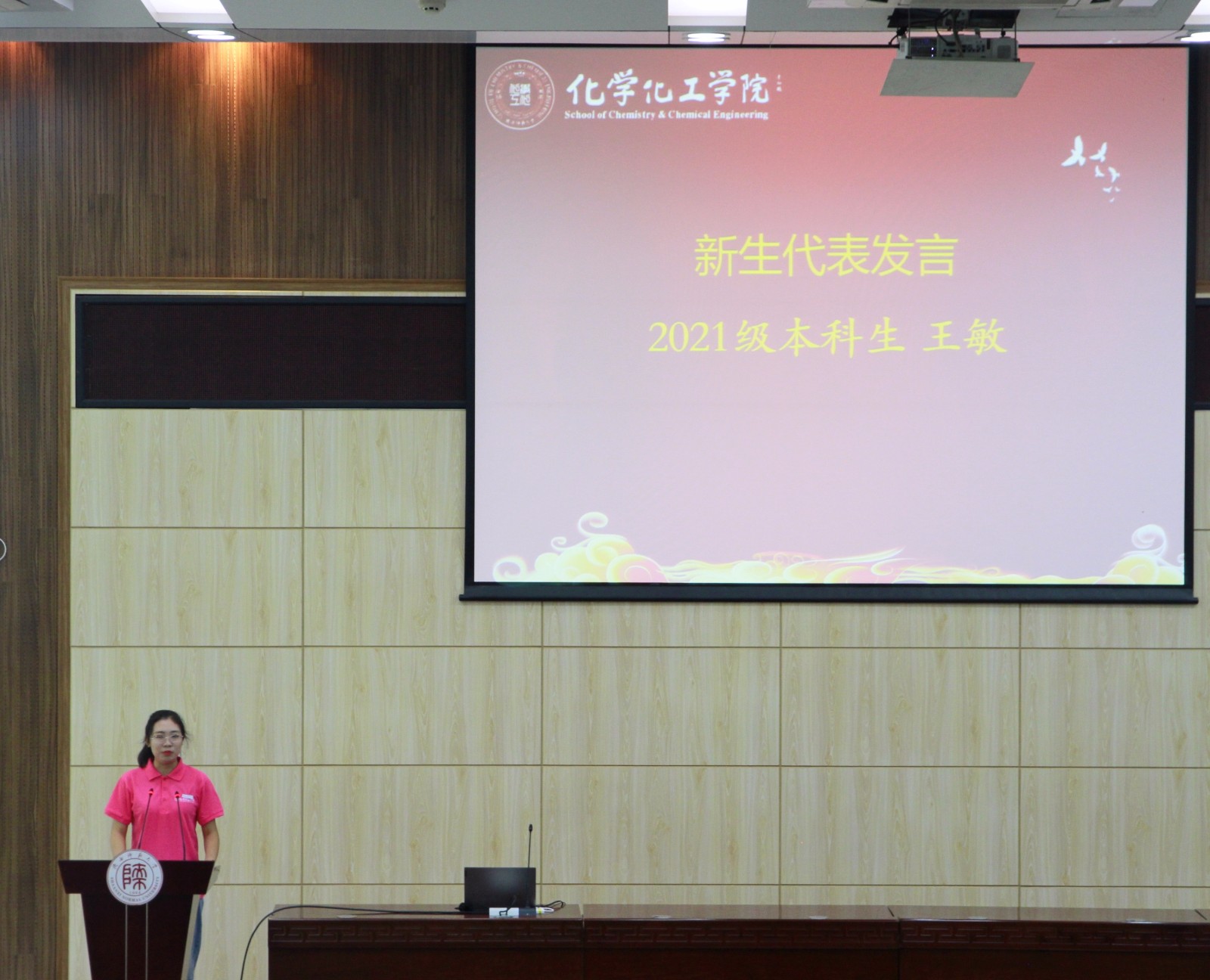 在校生代表2019级博士研究生王昆号召新同学向学校首届“西部红烛两代师表奖”获得者章竹君先生学习,努力践行“扎根西部、甘于奉献、追求卓越、教育报国”的西部红烛精神。新生代表2021级本科生王敏和2021级硕士研究生魏济明分别发言,表示百年未有之大变局已拉开序幕,作为师大学子,他们将戒骄戒躁、孜孜不倦,摆正求学态度,紧跟时代步伐,不忘初心、砥砺前行,书写人生新篇章。