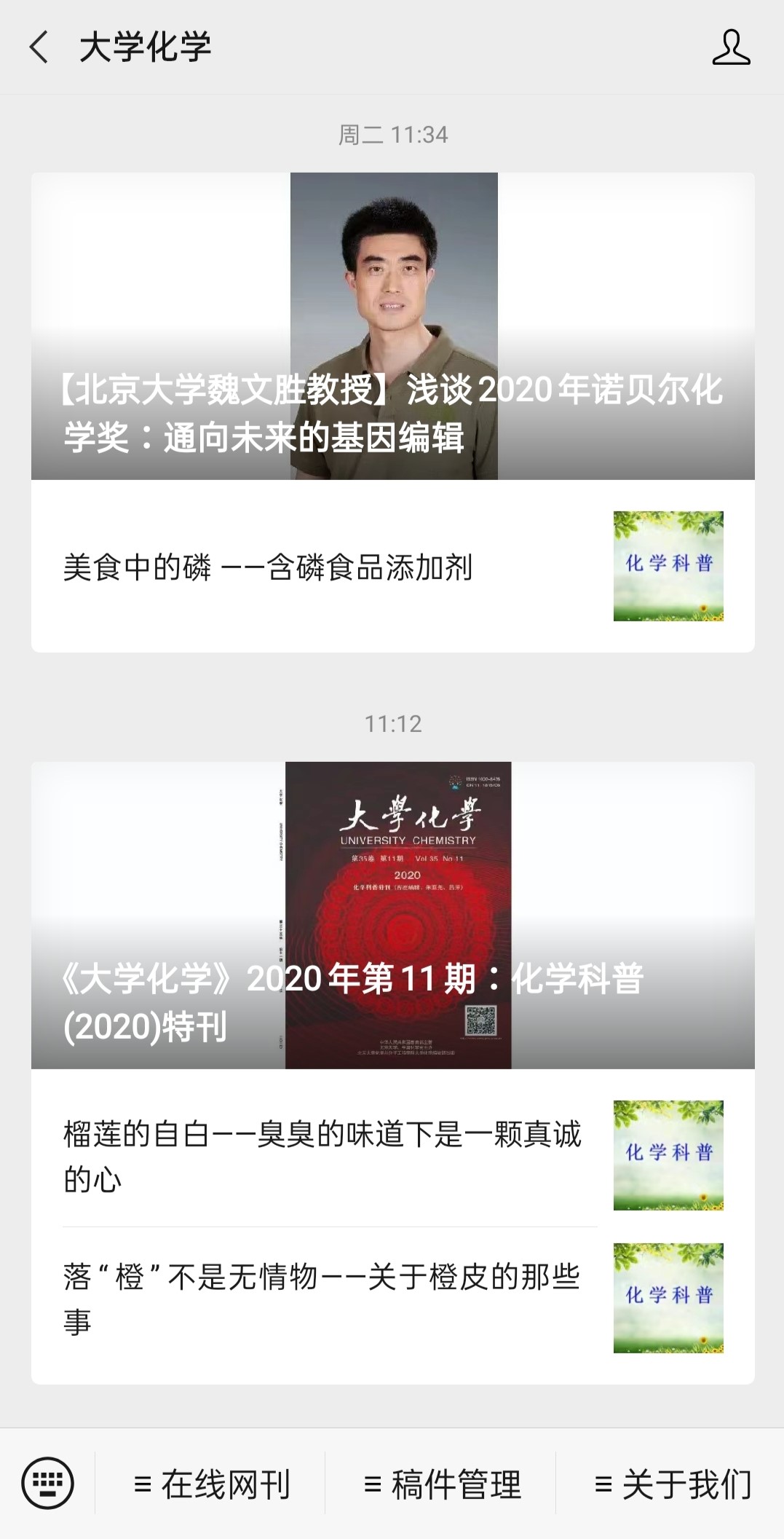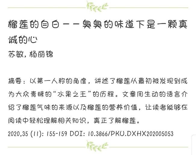 近日,由教育部主管、北京大学和中国化学会共同主办的教育研究性学术刊物《大学化学》出版了2020年第11期----化学科普(2020)特刊。《大学化学》科普特刊旨在为大众普及生活中的化学原理与知识,提高公众的基本科学素养,本期特刊精选38篇文章正式发表,其中大致分成元素故事、生活中的化学、化学实验以及综合型文章四个部分。在英国365集团公司焦桓教授的指导下,2019级本科生苏敏、杨丽锦所撰写的科普文章《榴莲的自白——臭臭的味道下是一颗真诚的心》在2020年《大学化学》科普特刊正式发表。