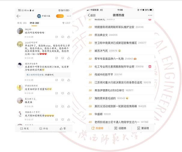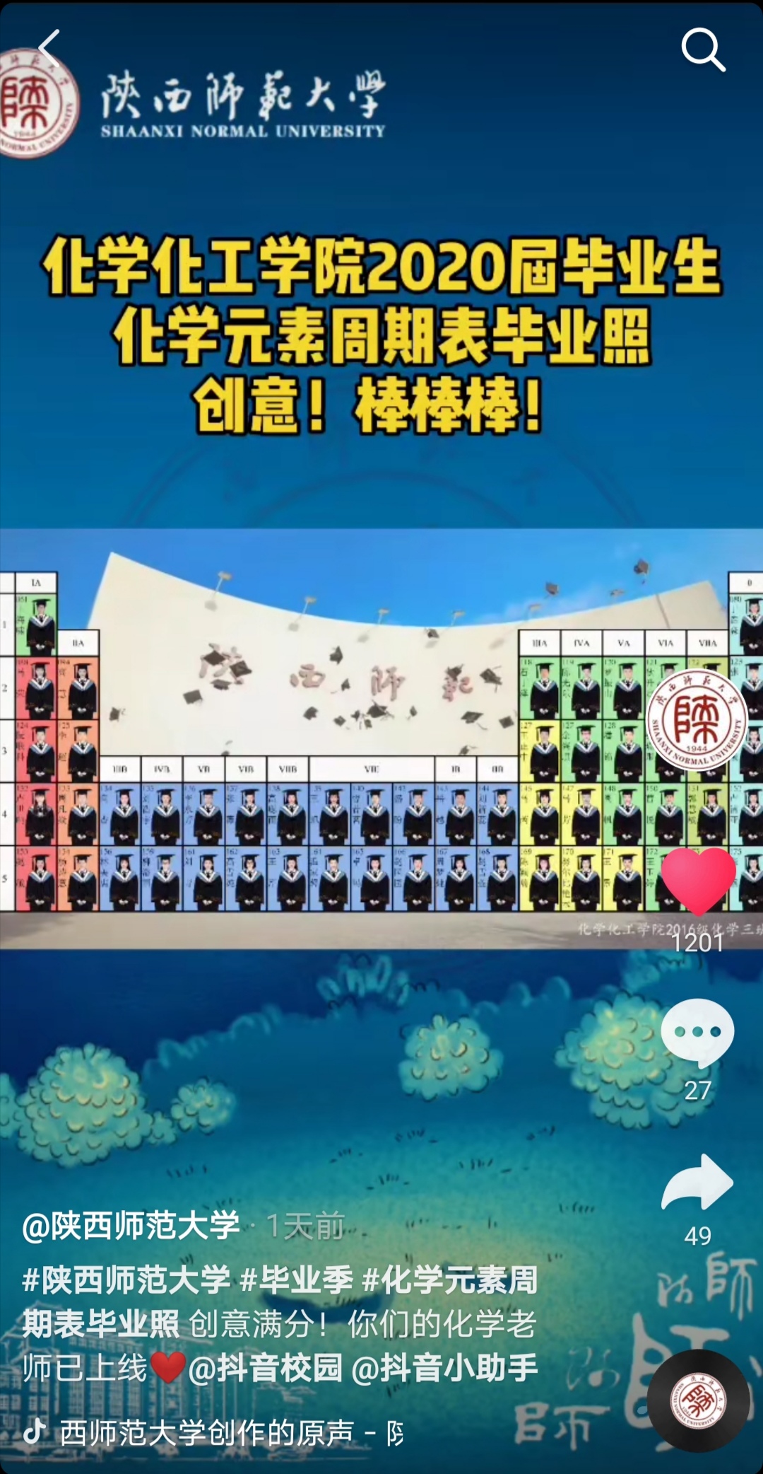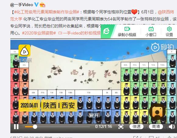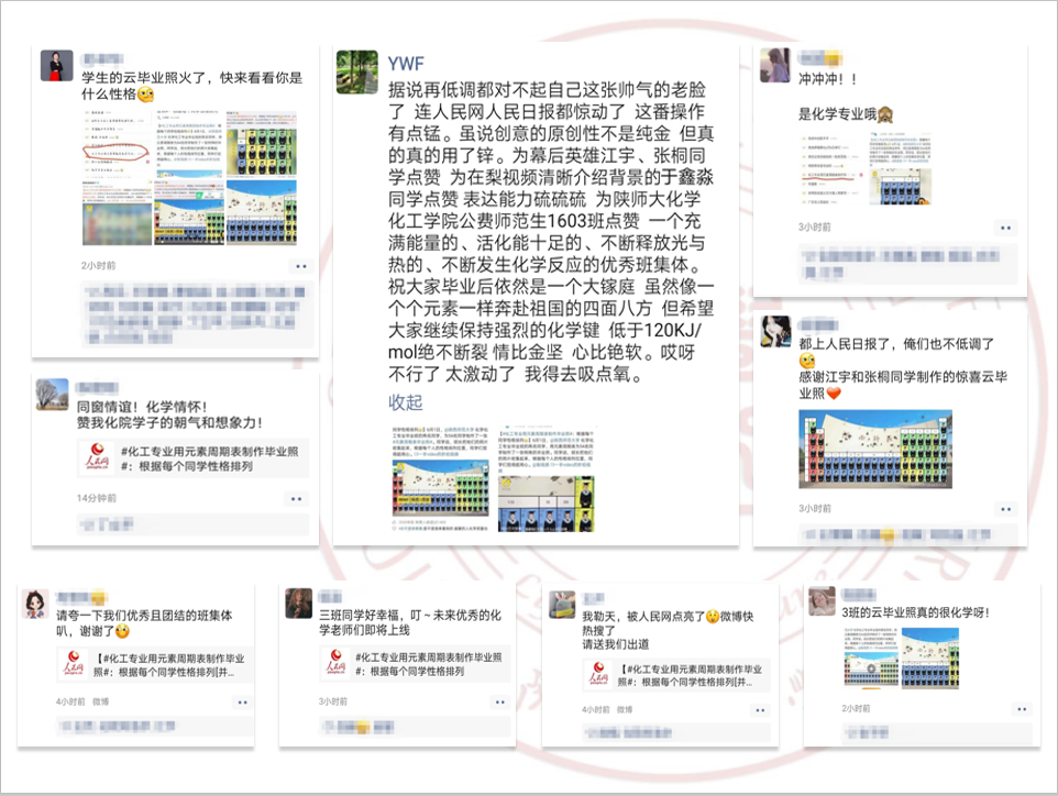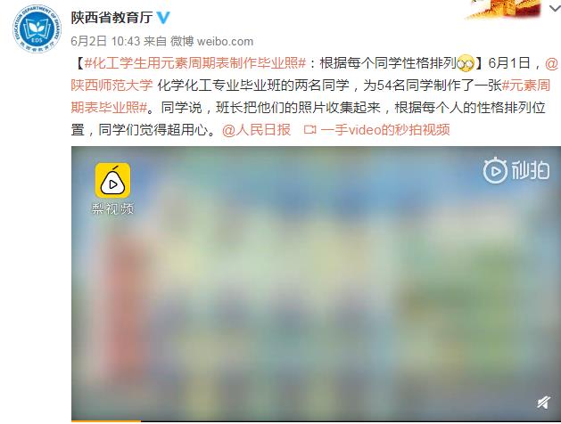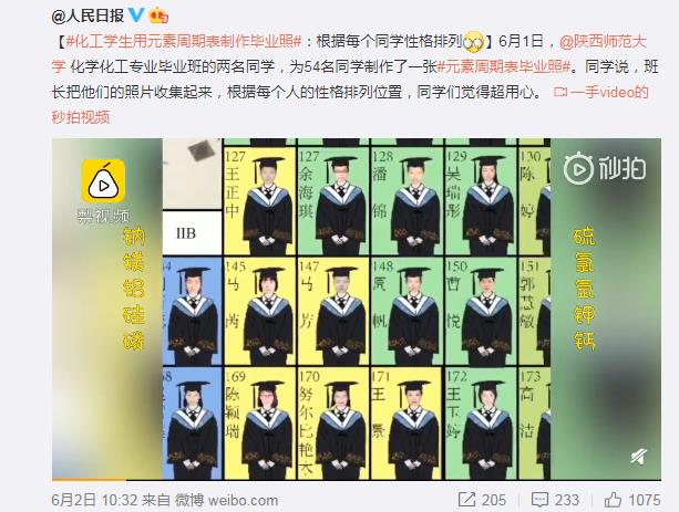 6月1日,英国365集团公司2016级化学专业的江宇和张桐两位同学,根据化学元素周期表中元素的特性与每个人性格的契合度,为全班54名同学制作了一张特殊的云毕业照,极富创意的毕业照引发不少微博用户关注,迅速登上微博热搜榜。随后,陕西师范大学、人民网、陕西省教育厅、梨视频、抖音、腾讯等多个新媒体平台纷纷转载报道,在校内外引起热烈反响。