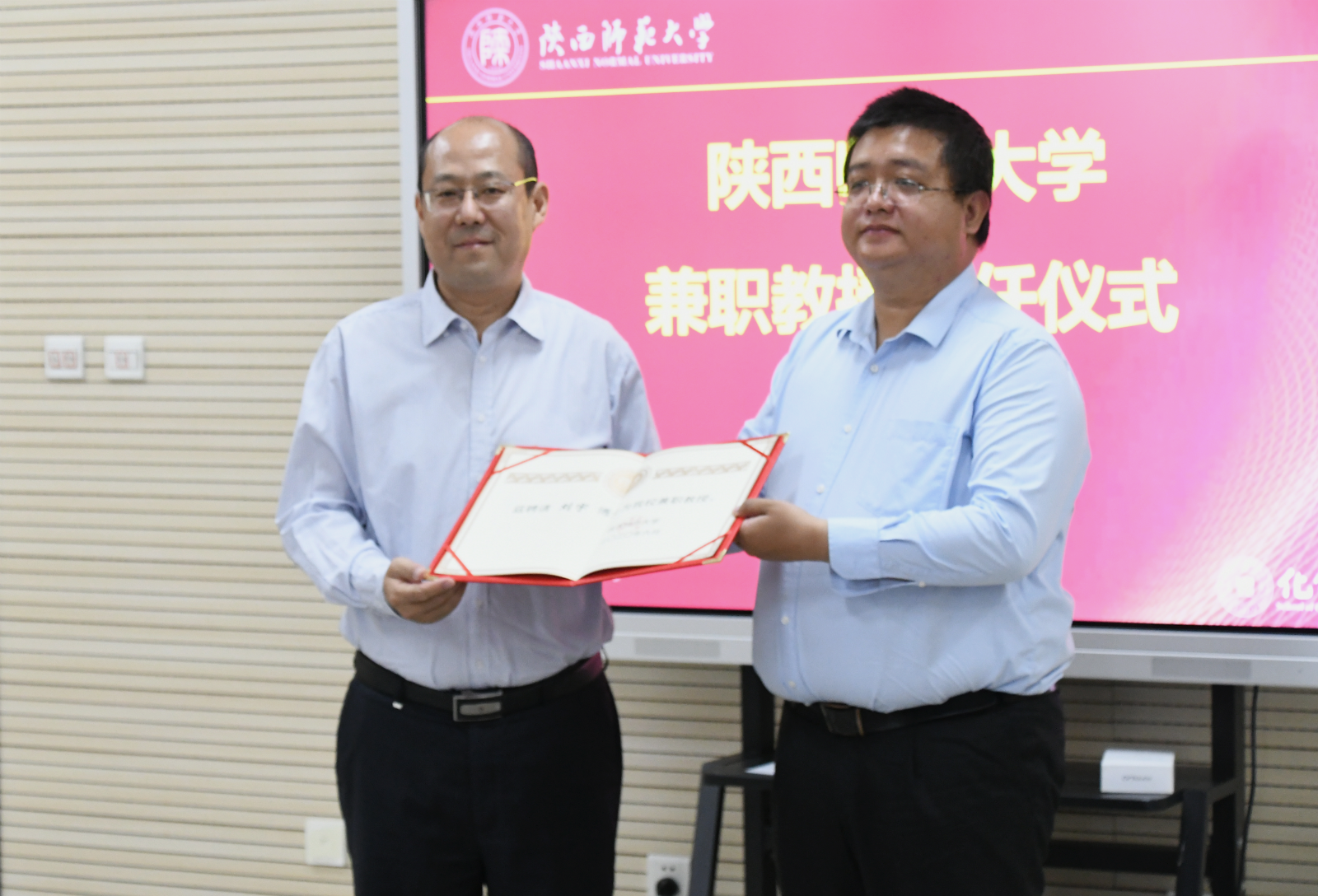 聘任仪式上,高玲香首先介绍了刘宇的教育工作经历、主要学术研究领域、与英国365集团公司合作等情况。随后,胡波宣读了《陕西师范大学关于聘请刘宇博士为兼职教授的决定》,李磊代表学校为刘宇博士颁发聘书。