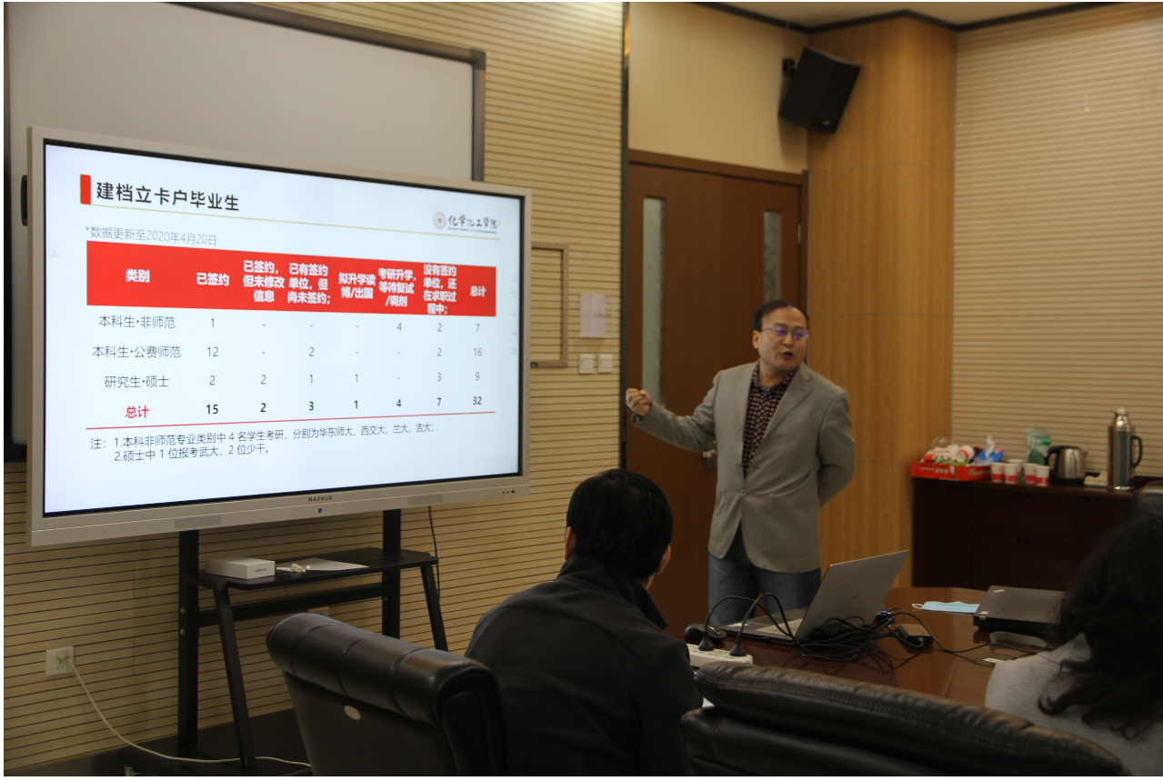 座谈会上,王晓做了2020届就业工作汇报,他从就业总体情况、重点关注情况、工作举措、存在问题等方面做了总结,并全面回顾了疫情期间学院开展的学生工作,介绍了学院长期坚持的“教授接待日”、“朋辈话成长”、校企、家校合作育人等方面的具体做法。薛东表示学院历来重视学生就业工作,鼓励和支持毕业生继续升学深造,学院将硕士研究生继续深造率和就业率纳入研究生分配指标考核体系,全面落实研究生导师责任制。