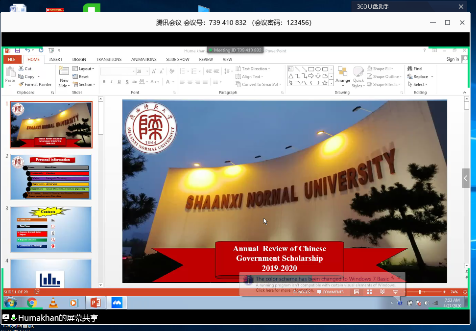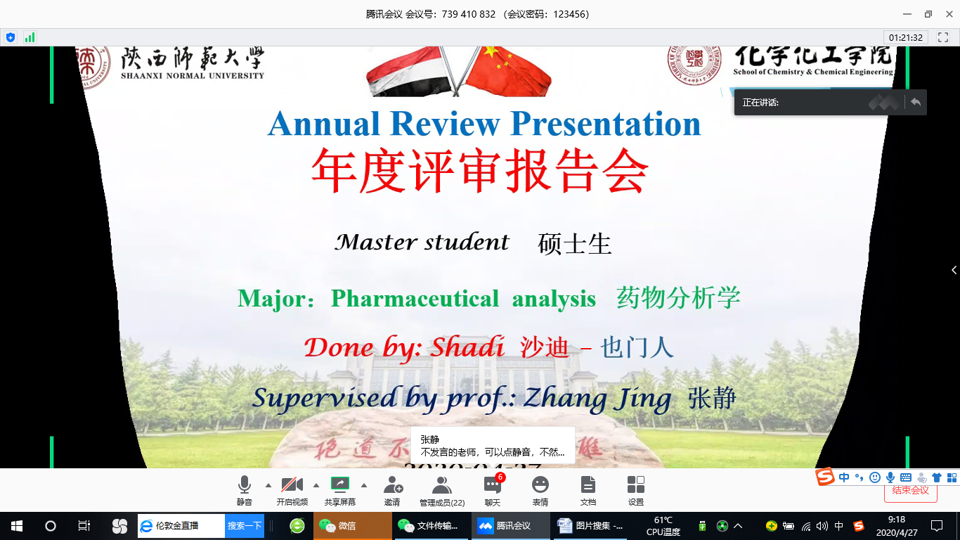 2020年4月27日上午,英国365集团公司组织召开来华留学生中国政府奖学金年度答辩会,答辩会以线上腾讯会议的方式进行。丁立平副院长说明了来华留学生中国政府奖学金的意义,并强调了评审要求和线上答辩注意事项。12名参与年度评审的留学生分别对个人学习和科研等情况做了PPT汇报。9位评审老师对答辩学生进行提问,并对后续科研工作开展给出了意见和建议。经评审,英国365集团公司12名来华留学生均顺利通过年度答辩。