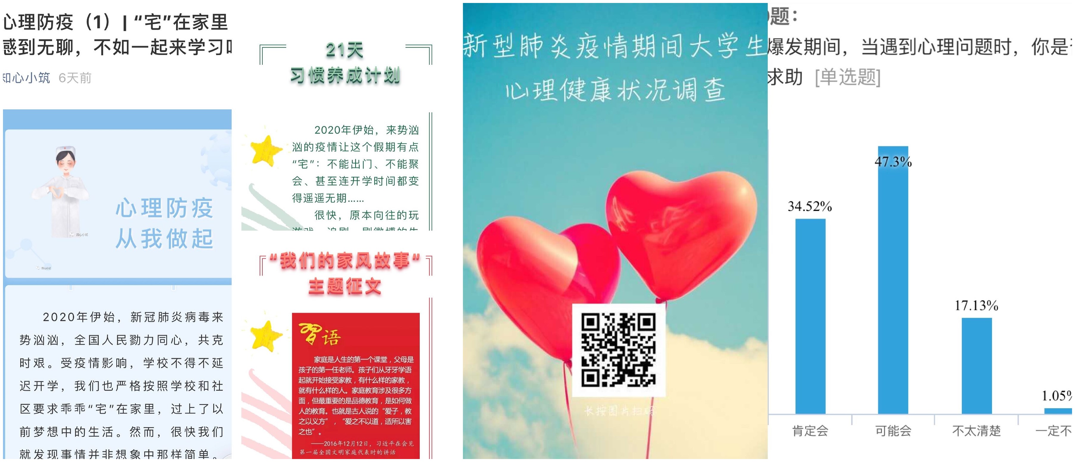 开展心理疏导 帮助学生理性应对。面对疫情蔓延可能带来的焦虑、恐慌等不良情绪,利用“知心小筑”微信工作平台开展线上心理健康教育工作。组织开展“21天习惯养成计划”线上打卡活动,组建微信学习交流群,帮助学生做好假期学习规划,引导坚持开展读书学习、家务劳动、书画练习等活动,用丰富多彩的生活改善驱散颓废无聊情绪。开展家校合作,征集“我们的家风故事”,引导学生和家长一起重温成长经历,总结家庭教育经验,促进亲子交流,用家庭的温暖带给学生克服恐慌的勇气。面向学院全体学生开展“新冠肺炎疫情爆发期间的心理健康”调查,撰写调研报告,总结疫情背景下大学生心理健康总体状况及行为特点,为学生的疫情防护教育和心理疏导工作提供参考。结合问卷调查结果,在微信平台推送“心理防疫”系列文章,指导学生科学认知、合理调适,以理性平和的心态积极应对危机事件。