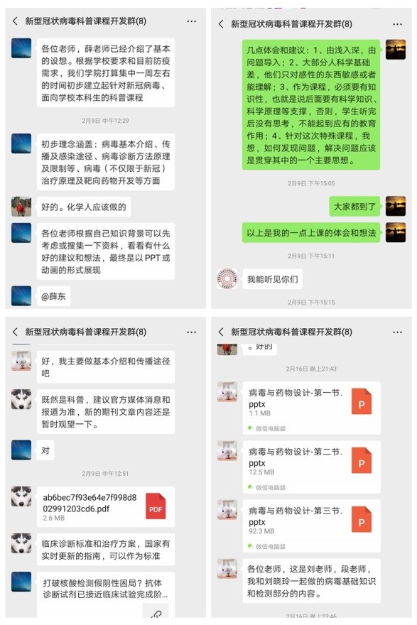 此外,为引导学生科学看待和认识本次疫情,充分认识化学的重要性,由薛东教授负责的一门线上混合教学通识教育选修课——《新型冠状病毒防控、检测与药物研发概论》(暂定名)已经初步建立完成并即将上线。该课程由薛东、丁立平、刘成辉、段新瑞、黄治炎、汤薇等教师在开学前集中一周时间,根据各自学科背景积极搜集整理各类资料建立完成。课程内容涵盖病毒基本介绍、传播及感染途径、病毒诊断方法、药物开研发等方面的内容,具备科普性和知识性,是面对全校师生的一门科普性课程。