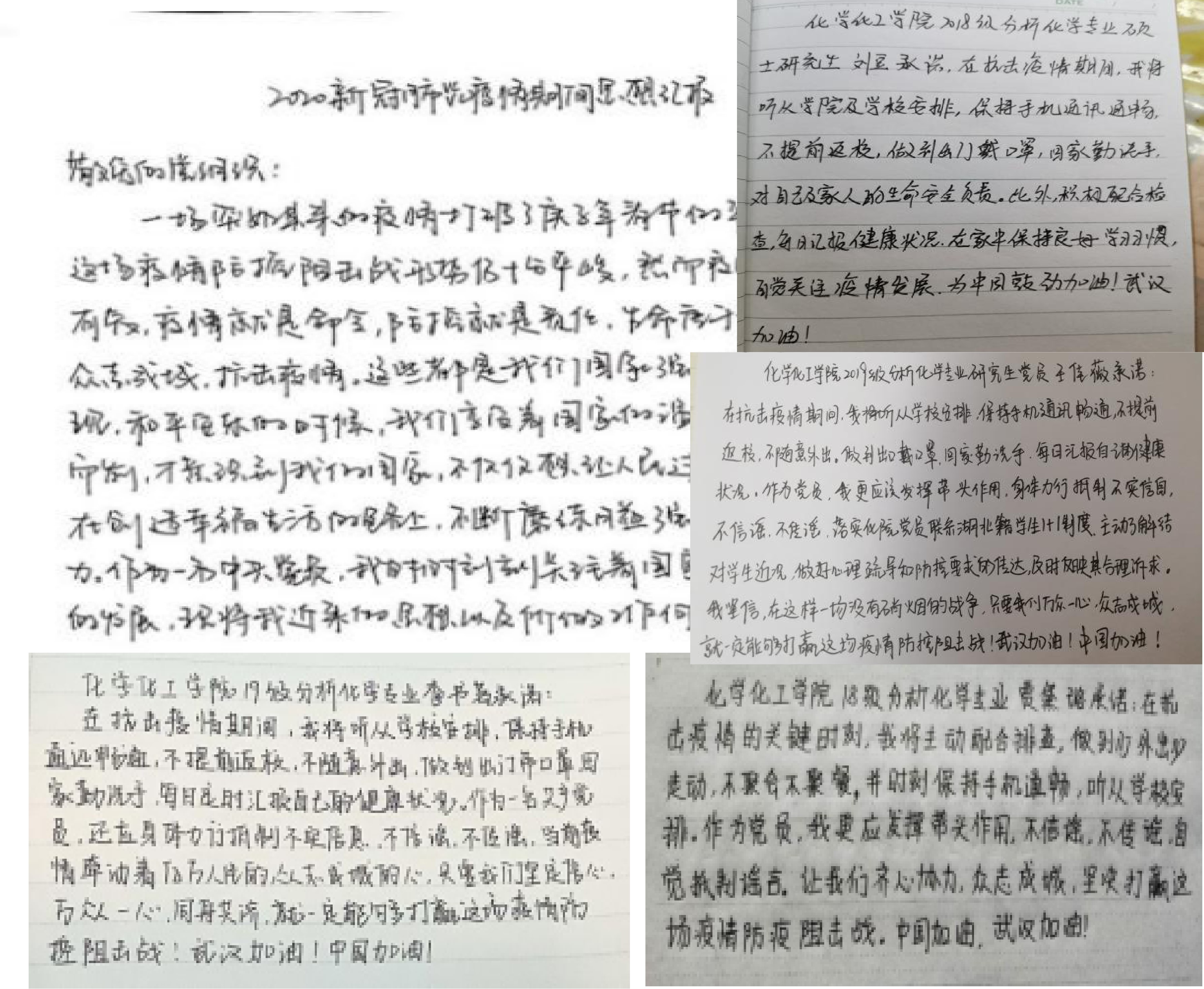 为坚决打赢疫情防控阻击战,在学校党委的统一领导和学院党委的统一指挥下,英国365集团公司研究生党员们以实际行动践行初心、勇担使命。研究生党员们带头预防,率先垂范,以志愿者身份积极投身当地防控疫情的工作中,让党旗在防控疫情斗争第一线高高飘扬;积极地缴纳了特殊党费;结合疫情防控现状做出郑重承诺,用笔尖书写对社会的责任;用书法和漫画作品表达了为武汉加油,为中国加油;积极向党组织在线提交抗击新冠疫情思想汇报。
