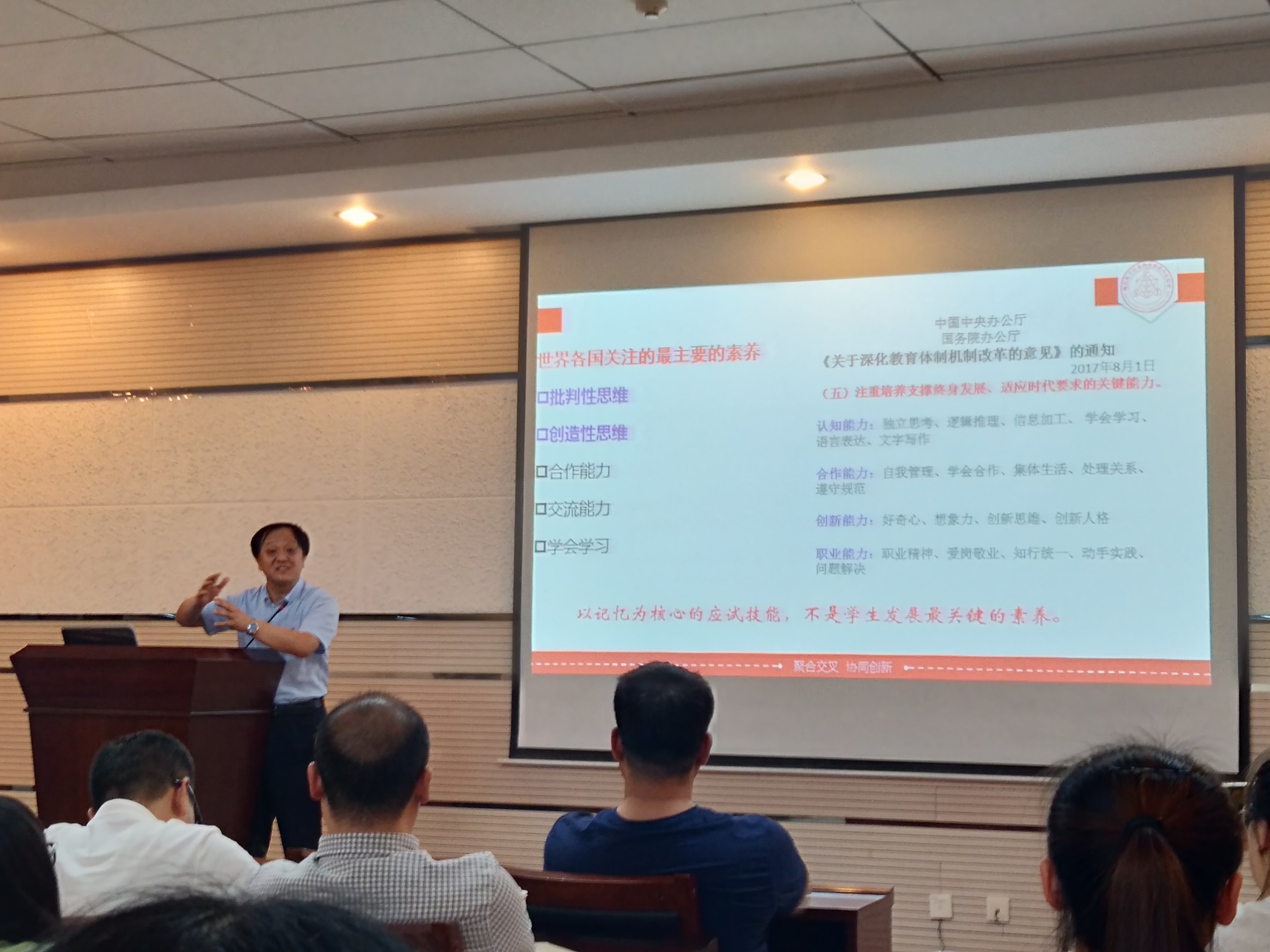 讲座伊始,胡老师就中西方在科技、工程和技术等方面的较大差异,提出未来中国发展重在掌握核心技术,而技术在于科学,科学又离不开基础教育。他指出,拔尖人才的培养关键在于基础教育,义务教育是树根,高中是树干,大学是叶子。胡老师结合自身研究经历,为大家介绍了思维型探究教学构建的相关理论与案例。他强调,教师素养的核心是教学能力,学生素养的核心是思维。教学不仅要近看,看细节,更要远看,看结构。教学生知识不只是为了让学生会做题,更是让学生真正理解知识的本质,激发学生主动去涉猎更广更深的知识,教师需要做的是不断地让学生去思考,因为没有思维,不成素养。他指出一名优秀的教师应该具有“高尚的职业理念、合理的知识结构、科学的教育观念、高超的教学能力”等素养。最后,胡卫平老师勉励同学们追求卓越,争做专家型教师。