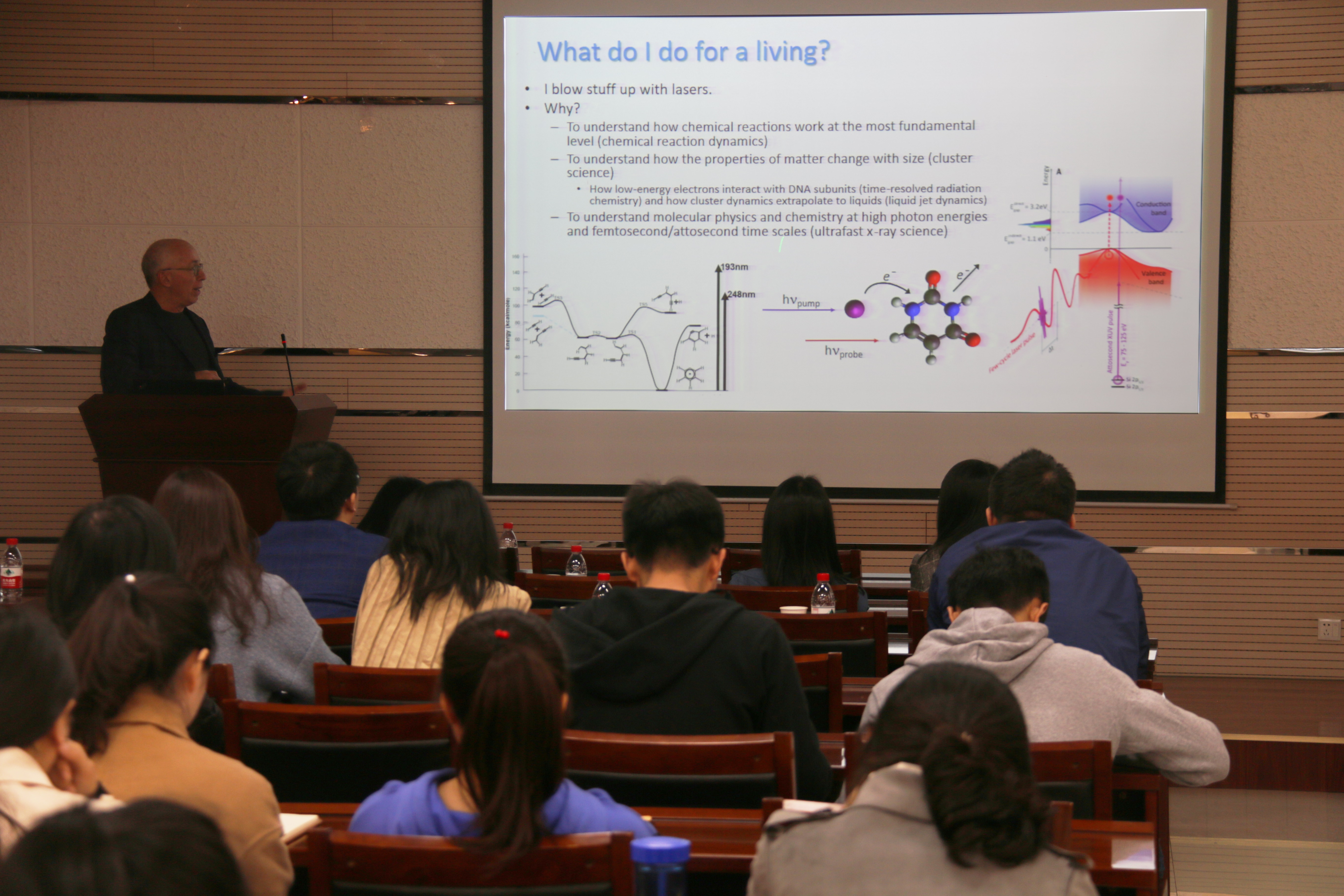 本次报告前,房喻教授对Daniel M. Neumark教授的科研经历做了介绍。Daniel M. Neumark教授是国际著名的物理化学家,入选美国国家科学院院士、美国艺术与科学院院士、美国科学促进会会士、美国物理学和化学会会士、英国皇家化学会会士。Neumark教授曾获美国化学会Irving Langmuir奖、美国物理学会Herbert P. Broida奖、英国皇家化学会Chemical Dynamics奖等多项荣誉,现任Science审稿编委,J. Chem. Phys.、J. Phys. Chem.、Chem. Phys. 、Phys. Chem. Chem. Phys.等杂志编委。