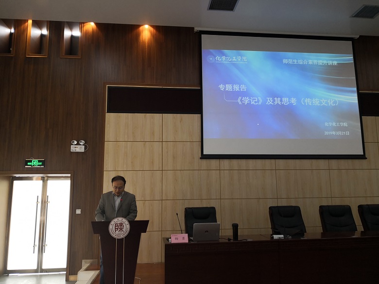 讲座伊始,杨老师从中国传统文化逐渐流失的现状谈起,阐述了传统文化传承的意义,强调了《学记》在我国教育领域的重要性。接着,杨老师结合其从教多年的所感所悟,带领现场同学重新学习了《学记》,从化民由学、教学为先、教学相长、教之大伦的七个方面、教之所兴的四条和大家分享了如何反思,如何听课,如何合作学习,如何交友,如何教学等一系列的教育思想和教育理念。