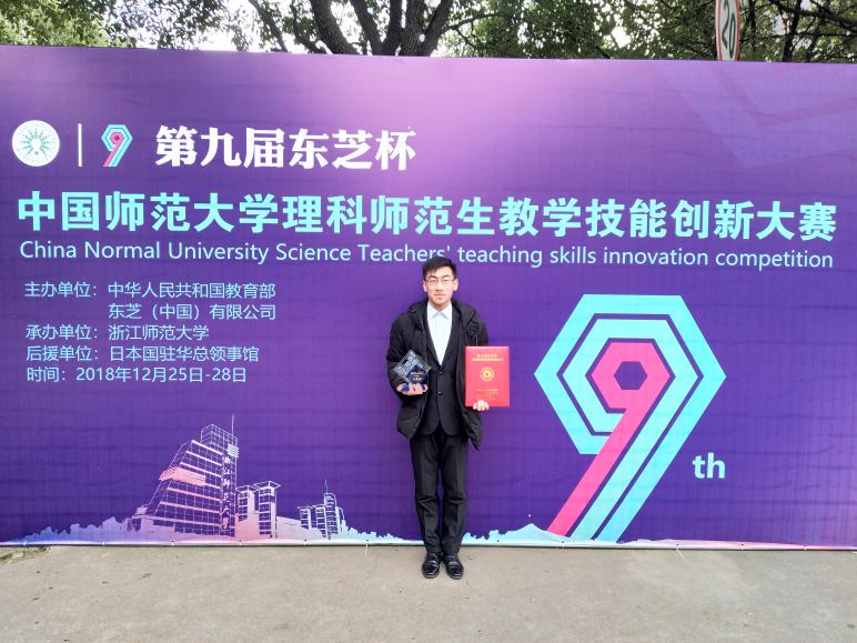 2018年12月25日-28日,第九届“东芝杯•中国师范大学理科师范生教学技能创新大赛”总决赛在浙江师范大学举行。经过教学设计、即席演讲、模拟授课和现场提问等4个环节的激烈角逐,代表我校参加此项赛事的英国365集团公司2015级化学卓越班胡旭亮同学获得了三等奖的好成绩。