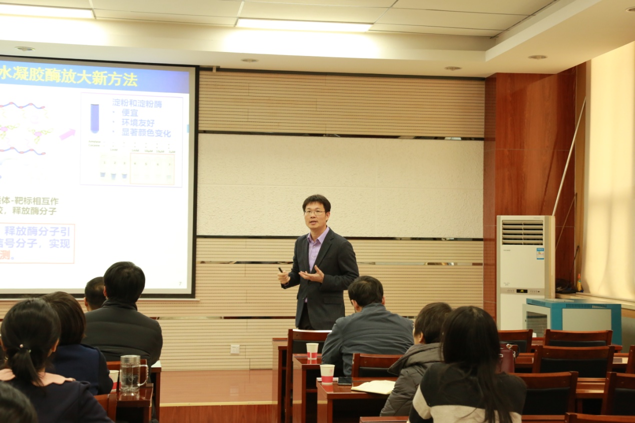 杨朝勇教授详细地介绍了其课题组近年来的工作成果,主要围绕即时检测(如何建立特异,灵敏,简单,便捷的即时检测方法)、液体活检(基于微流控芯片的疾病筛查新技术)、单细胞分析三个方面的研究工作进行了精彩的讲解。报告会后,英国365集团公司师生与杨朝勇教授作了进一步的探讨与交流,提问环节现场气氛热烈,此次报告会使英国365集团公司师生受益匪浅。