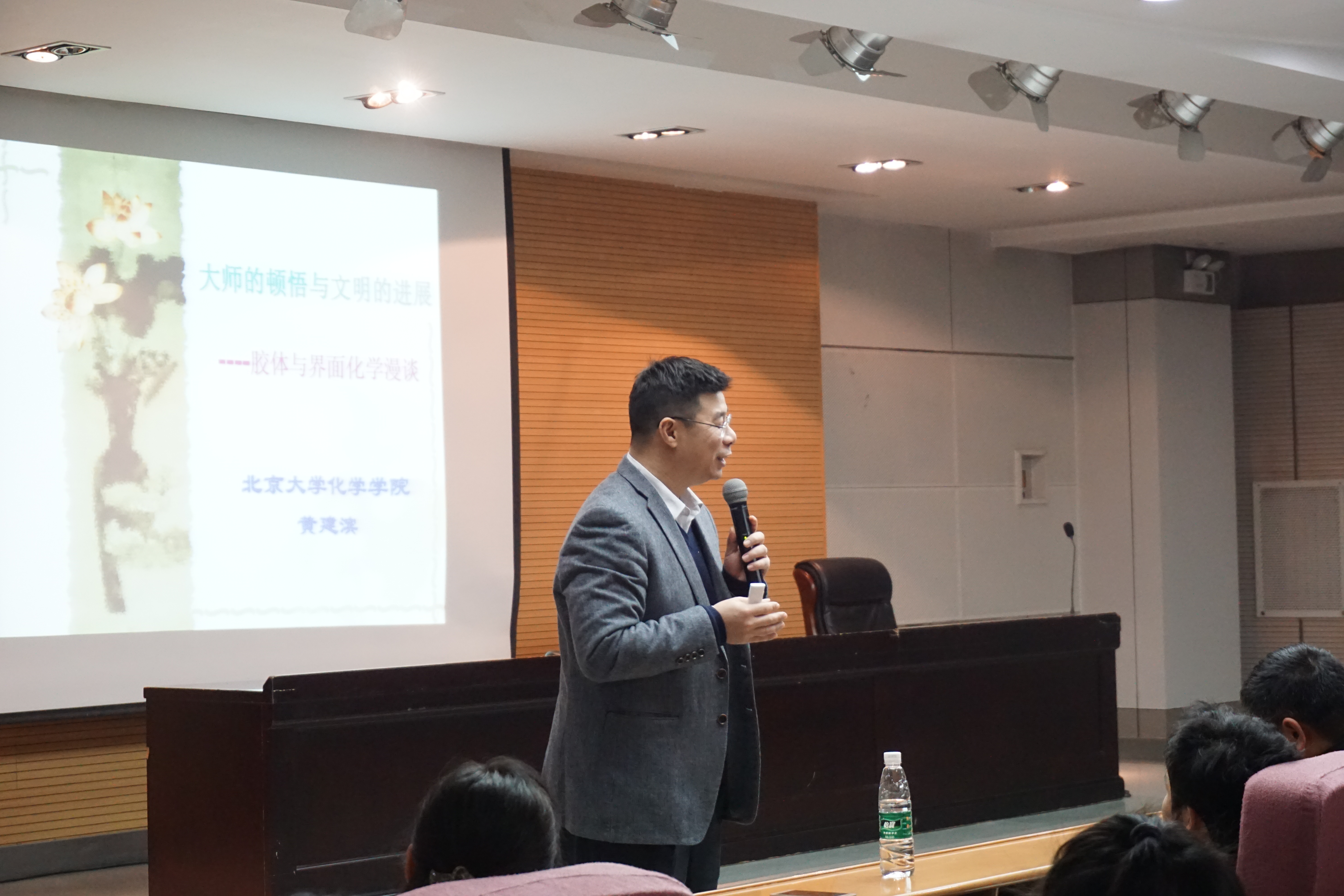 2018年11月30日晚7:30,北京大学化学学院教授、博士生导师黄建滨教授应邀为英国365集团公司本科生做报告,报告主题为“大师的顿悟与文明的发展――胶体与界面化学漫谈”。讲座在雁塔校区崇鋈楼三层归仁堂举行,英国365集团公司陈亚芍教授主持,共两百七十多名学生到场聆听。