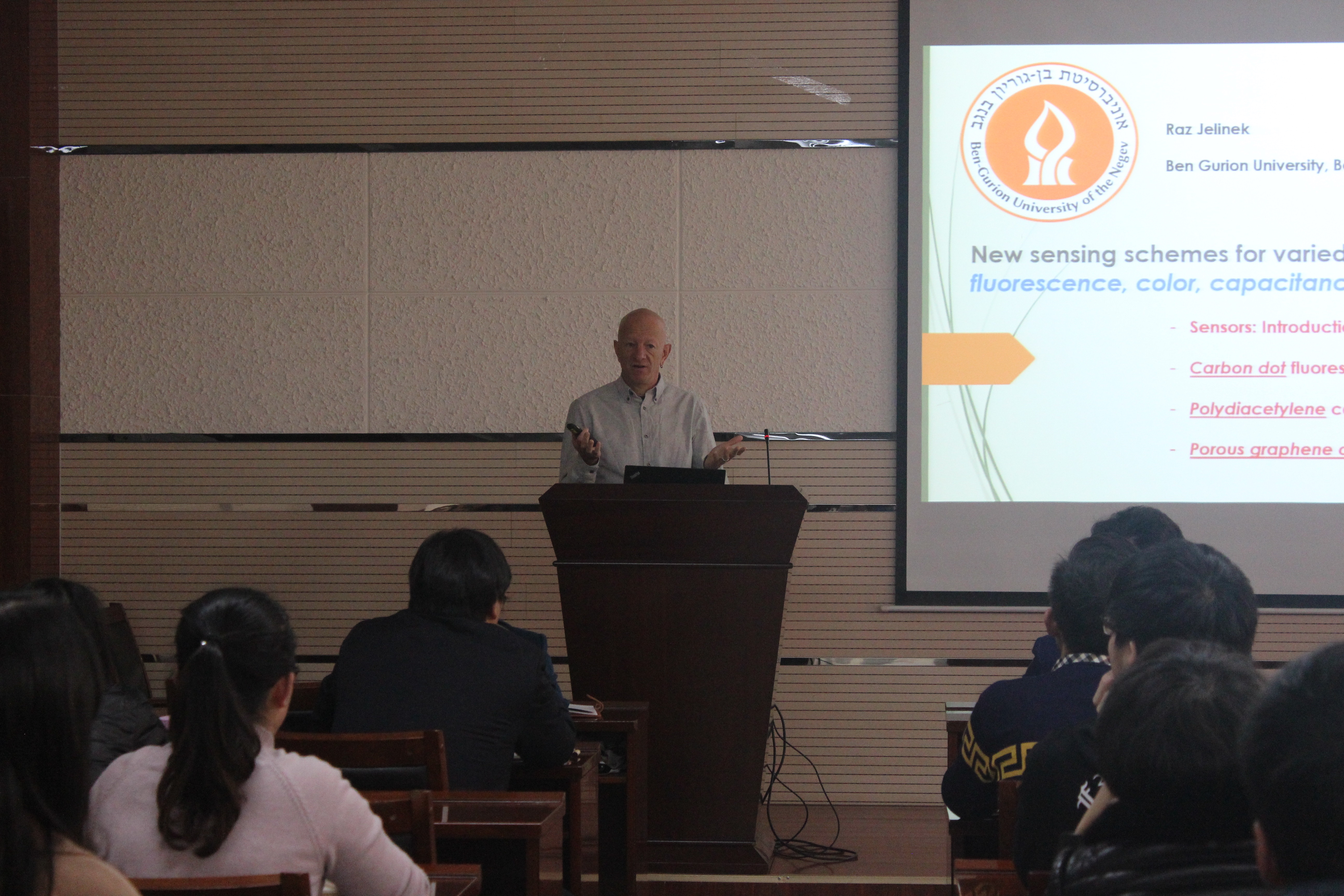11月9日下午,以色列本-古里安大学Raz Jelinek教授应邀访问英国365集团公司进行学术交流,并在致知楼1668报告厅为英国365集团公司师生带来了题目为“New Sensing Schemes for Diverse Biological and Chemical Targets”的报告。英国365集团公司唐艳丽教授、漆红兰教授、边红涛教授、丁立平教授、刘太宏、彭浩南、刘全、王刚和Somnath Mukherjee博士等以及英国365集团公司相关专业研究生和本科生聆听了本次学术报告。报告会由丁立平副院长主持。