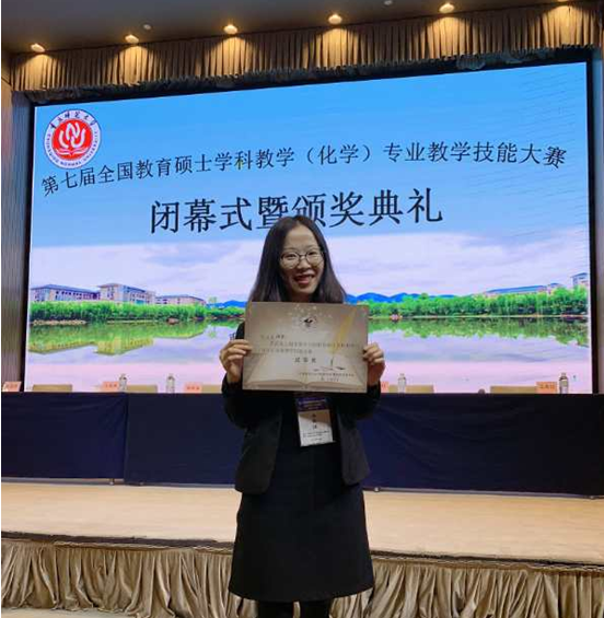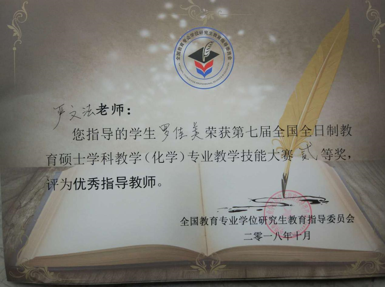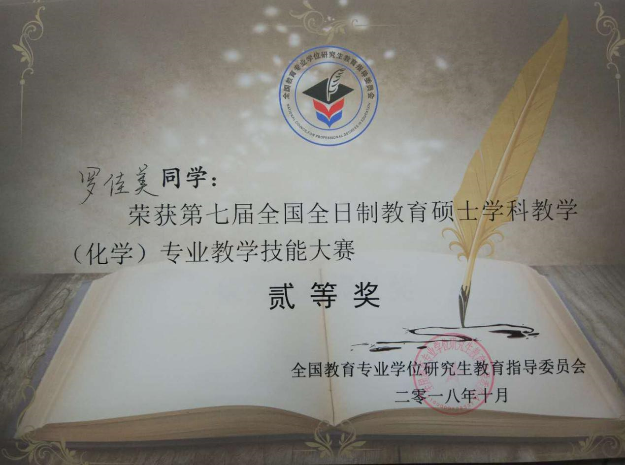 金秋十月,丹桂飘香。缙云山下,嘉陵江畔,第七届全日制教育硕士学科教学(化学)专业教学技能大赛于10月22日在重庆师范大学举行,英国365集团公司罗佳美同学喜获二等奖,延倩倩同学荣获优秀教学设计奖,严文法老师荣获优秀指导教师奖。