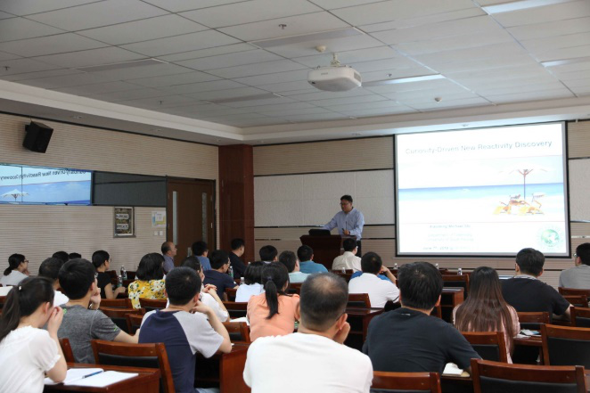 报告中,Brain Space教授为英国365集团公司师生讲解了如何利用理论计算化学解决MOF材料的气体吸附方面的问题;施晓东教授则为我们展现了有机化学的神奇与奥秘以及他们课题组在1,2,3-三氮唑化学方面取得的重要研究进展;李霄鹏教授通过生动幽默的语言为我们阐述了如何通过自组装的策略逐级构筑优美的笼状超分子结构。最后,蔡健峰教授为我们讲述了生物有机化学方面的知识以及他们在多肽组装方面所取得的进展。整场报告涵盖面广,信息量大,具有启发性。