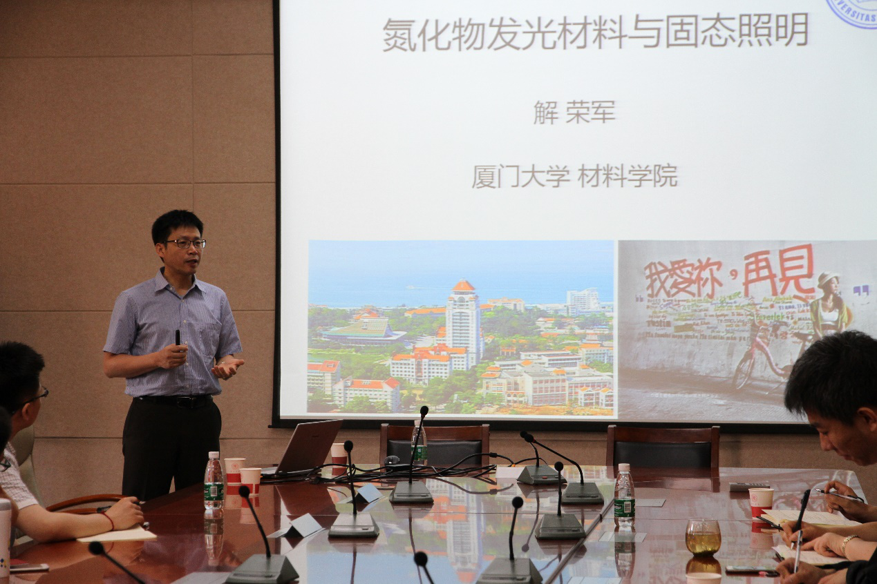 5月18日,厦门大学解荣军教授受邀来英国365集团公司学术交流,在致知楼1568会议室为英国365集团公司师生带来了题为“氮化物发光材料与固态照明”的学术报告。物理学院郑海荣教授、材料学院苟婧副教授、高级实验师晁小练,英国365集团公司副院长焦桓教授、刘志宏教授等教师及相关专业研究生、本科生参加报告会。报告会由焦桓主持。