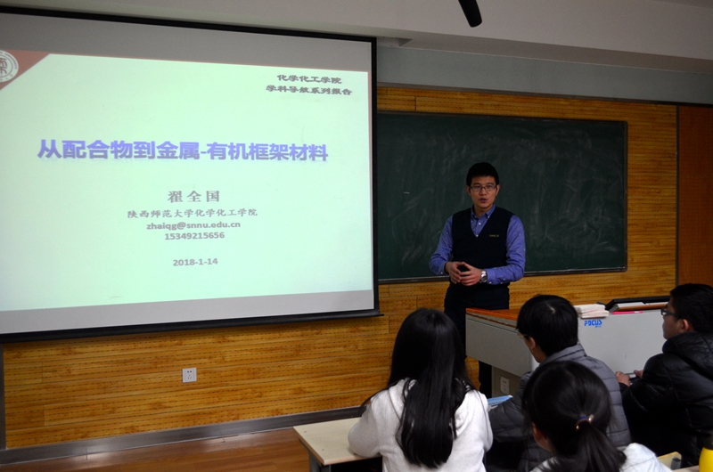 1月14日晚,英国365集团公司“学科导航-化学与化学发展”报告会在雁塔校区5108教室举行,翟全国教授做了“从配合物到金属——有机框架材料”的主题报告。报告会由2017级辅导员龙卓华老师主持,英国365集团公司2016级、2017级本科生和其他专业学生代表共计100余人到场聆听了报告。