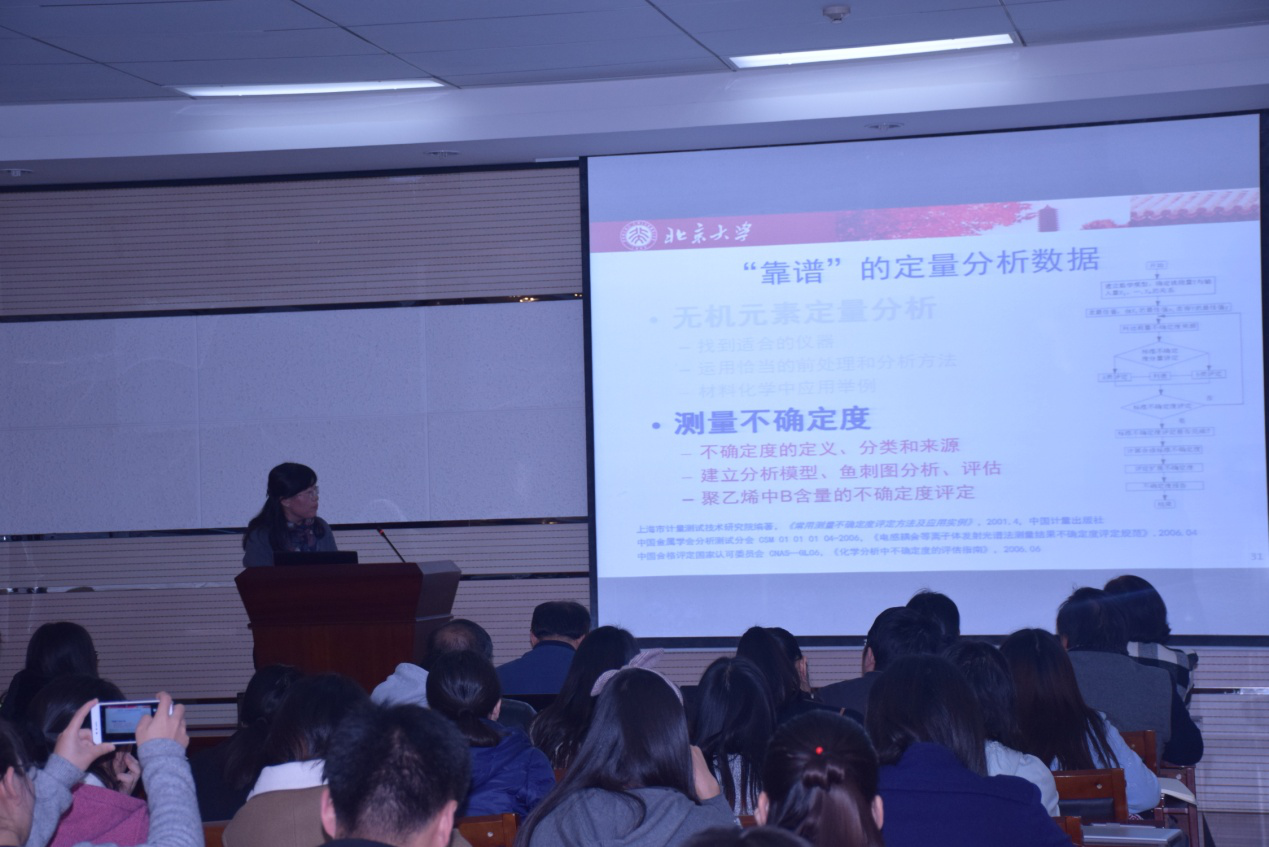 报告中,谢景林教授介绍了XPS的原理、功能、对科学研究的贡献、应用及(准)原位分析,并对光电子能谱技术的完善与发展提出了自己的见解。扶晖博士在报告中介绍了核磁共振原理、液体核磁共振与固体核磁共振及其应用。张莉博士以有趣的题目将大家的注意力引入元素分析的报告中,通过无机元素定量分析、测量不准确度两大部分向大家讲解了如何得到准确度高的数据。鞠晶博士则向大家介绍了扫描电镜的相关知识。周江教授在报告中展示了北京大学分析测试中心的信息化建设,并列举了一系列质谱在最新科研成果中的应用实例。整场报告深入浅出,英国365集团公司师生授予匪浅。