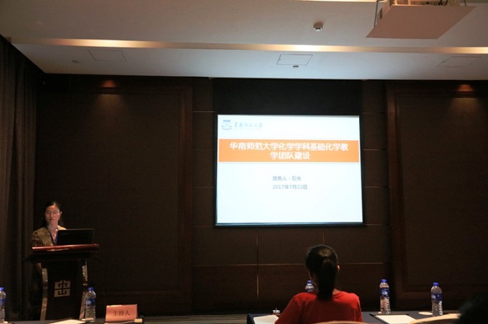 2017年全国高等师范院校化学课程结构与教学改革研讨会期间,共举行7场大会报告,18场邀请报告。在7月22日下午的第一分会场,共有9场邀请报告,报告人分别为:华中师范大学万坚教授、辽宁师范大学王长生教授、安徽师范大学张小俊教授、东北师范大学杜锡光教授、华南师范大学石光教授、华中师范大学龚静鸣教授、广西师范大学卢昕教授、东北师范大学陈彬教授以及我校英国365集团公司陈亚芍教授等9位专家学者。会议主持人为东北师范大学朱广山教授和我校英国365集团公司李保新教授。
