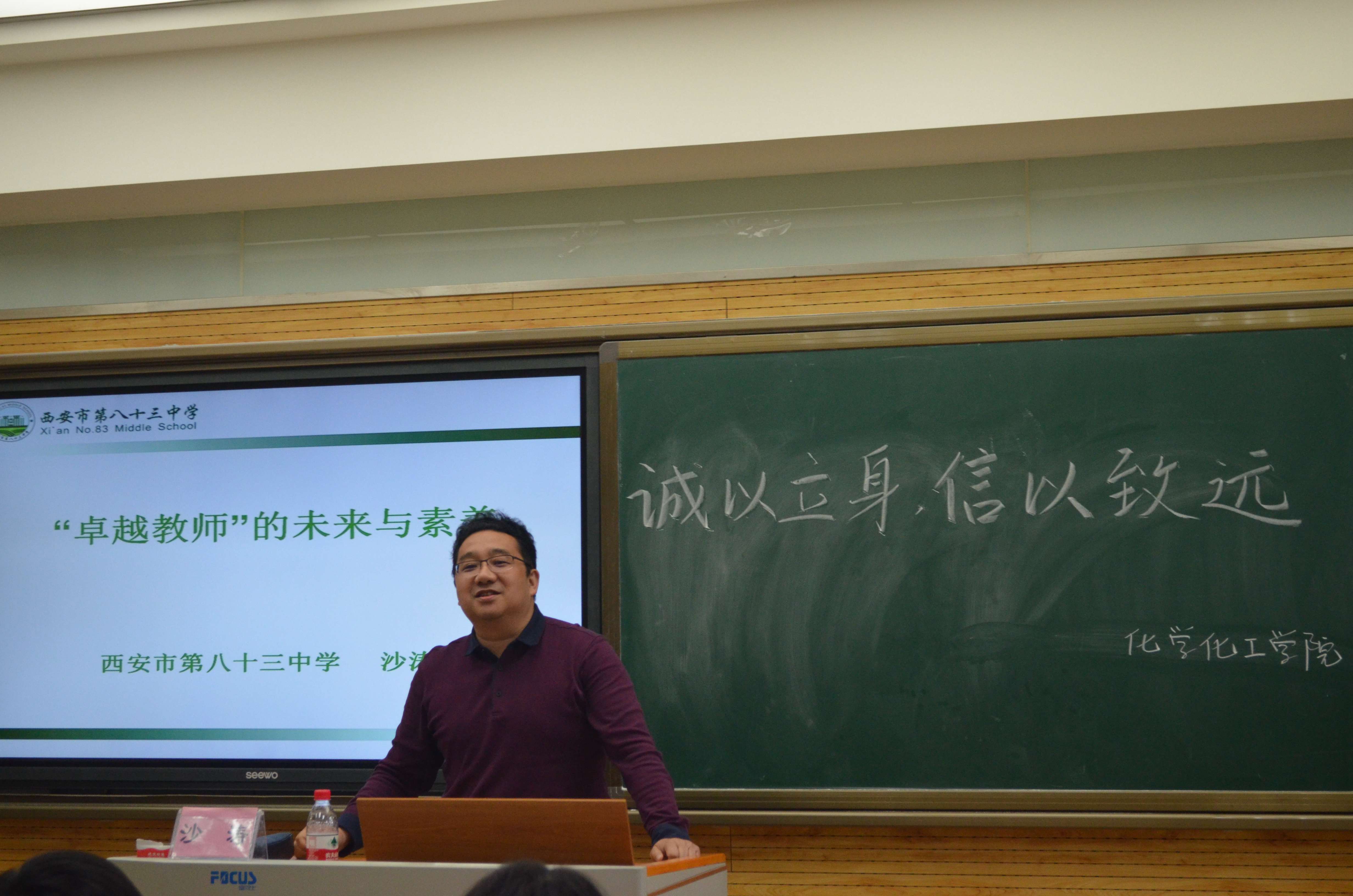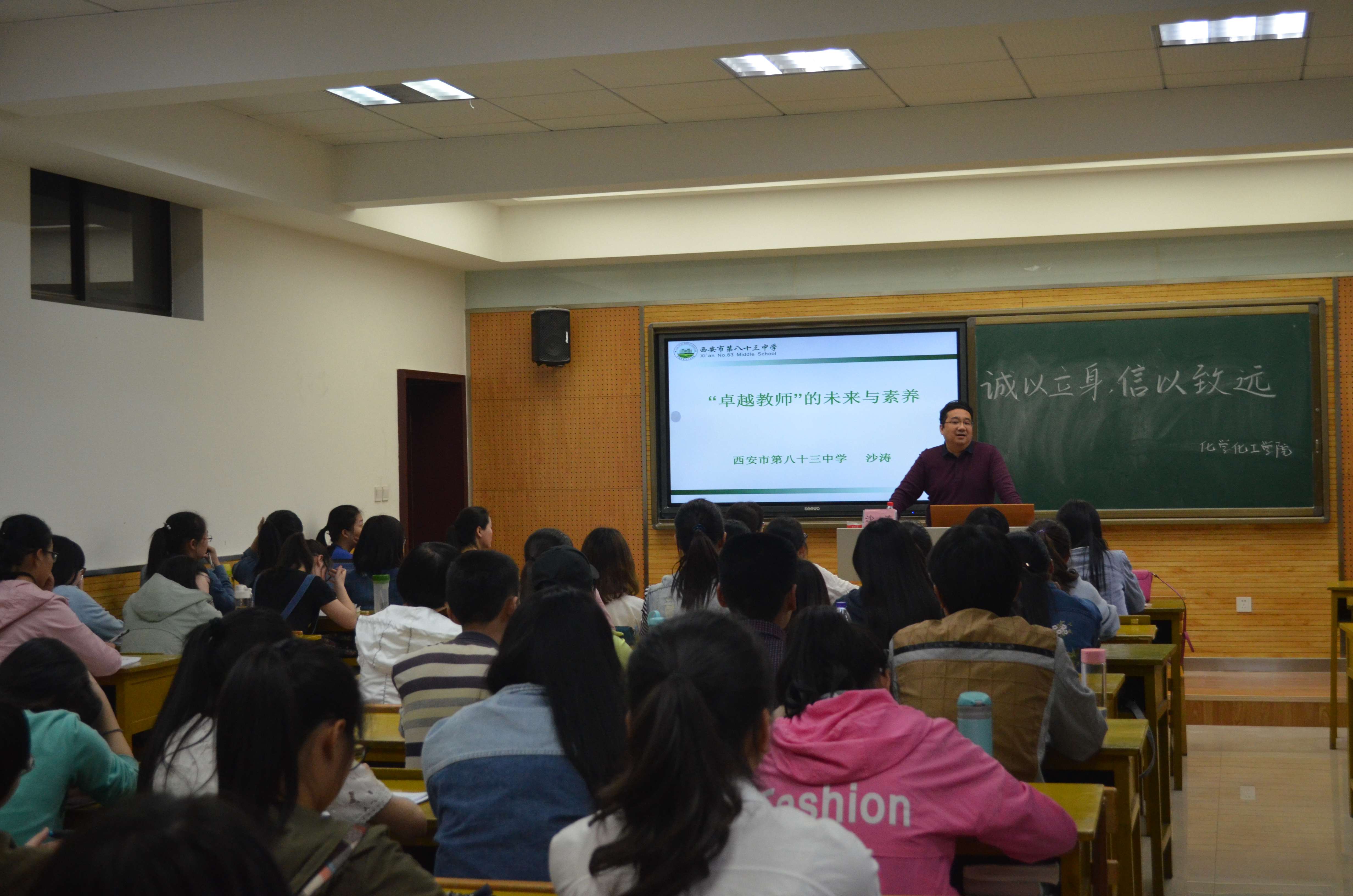 为加强同学们对当今教育形势的了解,4月27日下午, 15、16级化学卓越班邀请西安市第八十三中学教学副校长沙涛老师在5203教室开展了名为“卓越教师的‘未来’与‘素养’”的主题讲座。本次讲座由陈亚芍教授主持,李盼宁老师、龙卓华老师出席了此次讲座。