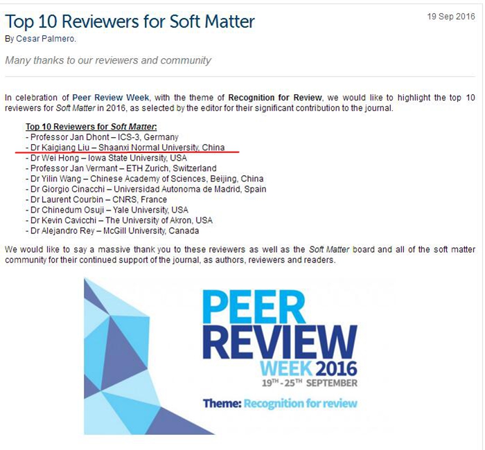 9 月 19-25 日是 2016 年度全球 Peer Review Week 周,今年的主题是 “Recognition for Review”,旨在表彰为期刊出版、基金评审、会议申请等一系列工作作出重大贡献的评审人员。本届 Peer Review Week 期间,英国皇家化学会评选出了旗下 43 本期刊每本期刊的十佳评审人。英国365集团公司刘凯强博士荣获《Soft Matter》期刊十佳审稿人。