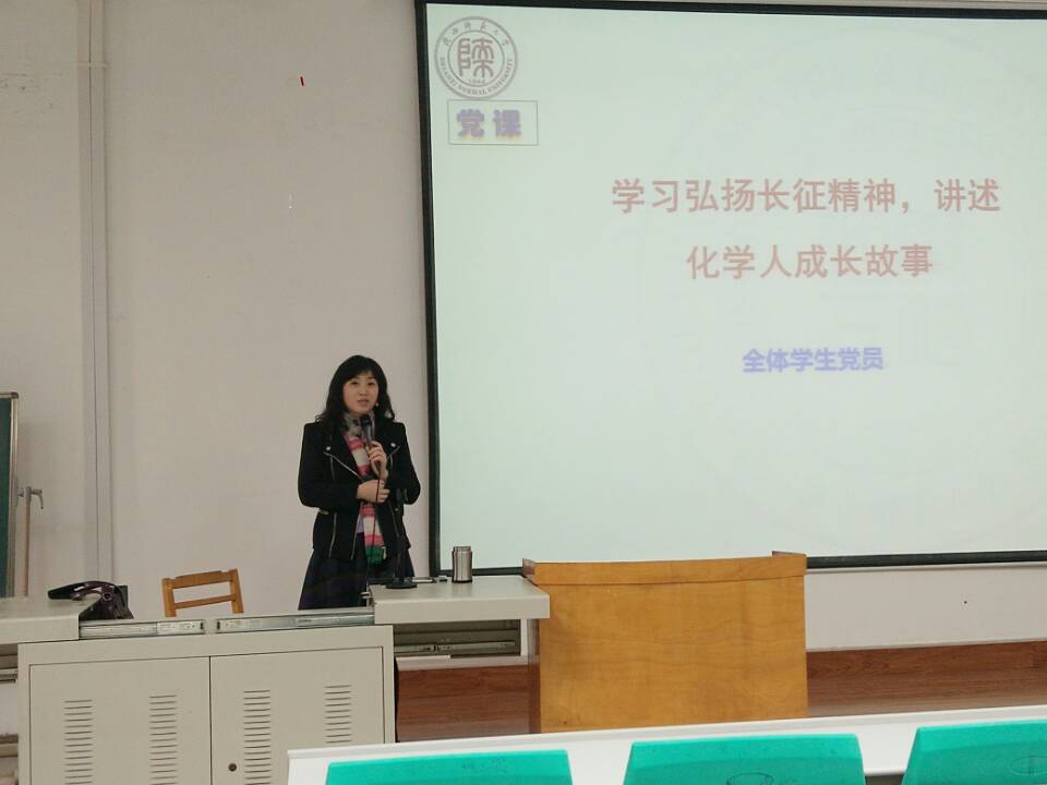 学生支部采取领导讲党课与个人自主学习相结合的方式进行学习讨论。在学生党员自学的基础上,学院党委书记高玲香教授讲了以“学习弘扬长征精神,讲述化学人成长故事”为专题的党课。党课中,高书记深入浅出地向各位党员同志详细讲述了长征是什么、什么是长征精神以及如何走好新的长征路等内容,同时以学院部分前辈和杰出教师的事迹鼓励大家把“长征精神”和我们的“化学精神”、“学院精神”结合起来,最终落实到自己的科研工作和生活中去。