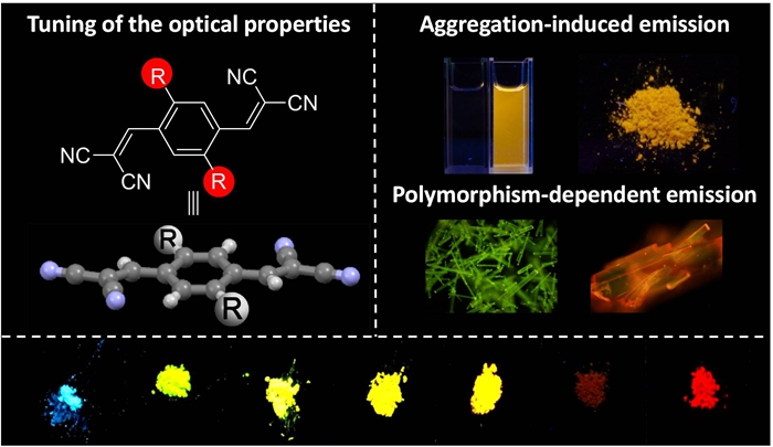 针对这一难题,英国365集团公司“生物正交与小分子探针”研究团队的赵娜、李楠副教授与香港科技大学唐本忠院士合作,通过在2,2-二氰基乙烯基苯的2,5位引入具有不同电子和位阻效应的非芳基和芳基作为电子给体,获得了两个系列具有光谱可调谐的固体荧光材料。对分子发光行为以及晶体堆积方式的系统深入研究表明:当取代基为非芳基时,整个分子的构型趋近平面化,分子间具有较强的π-π相互作用,导致其固态发光效率降低;而芳基取代基的引入能够使分子具有高度扭曲的构型,从而有效避免了分子间π-π相互作用的产生,使其具有较高的固态发光效率和独特的聚集诱导发光(AIE)性质。该体系中的一些AIE分子还表现出独特的同质多晶现象和压致变色行为。这一研究结果为设计合成新型的有机固体发光材料提供了新的思路,该类结构简单的发光材料还有望应用于生物标记领域。