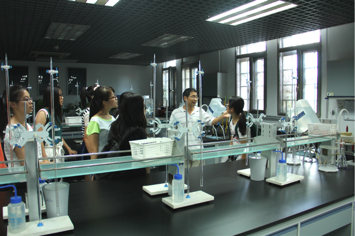 活动第一站——北京大学化学与分子工程学院。首先,实验中心副主任高珍老师带领同学们参观了北京大学化学基础实验教学中心和化学实验示教中心,每到一处,均有专业老师详细讲解。参观过程中,高主任着重对北大本科生化学实验课程体系设置、培养目标及创新形式等内容进行了阐述,并对四大基础化学实验室及常用仪器纷纷做了介绍。在化学实验示教中心,同学们对陈列的不同年代的天平、剖开的测试分析仪器、“编织”的化学大分子模型等产生了浓厚的兴趣,纷纷表示通过实物参观,对一些先前只能在书本上看到的仪器及内部构造有了更直观的印象。最后,同学们参观了北京大学化学与分子工程学院邵元华教授、刘虎威教授及李娜教授的实验室,了解了他们在“软界面电分析化学”、“生物分离与检测”、“生化分析、发光测定方法”等领域做出的突出贡献。参观活动在同学们与北大化学院研究生的热烈讨论中结束。