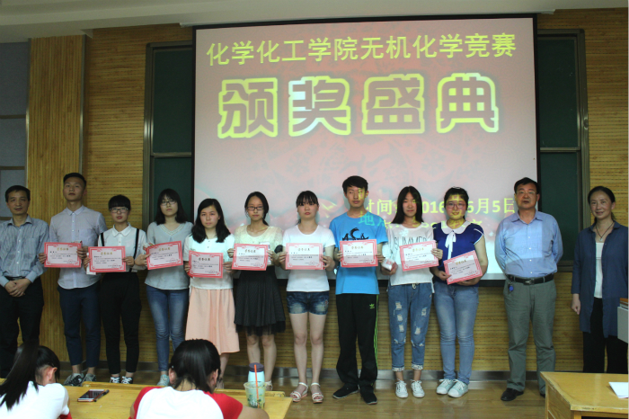 2016年6月5日晚七点,英国365集团公司在雁塔校区5301教室举办了无机化学竞赛颁奖活动。英国365集团公司李保新副院长、刘志宏教授、蒋育澄教授、2015级化学类辅导员龙卓华及一百多名获奖学生参加。
