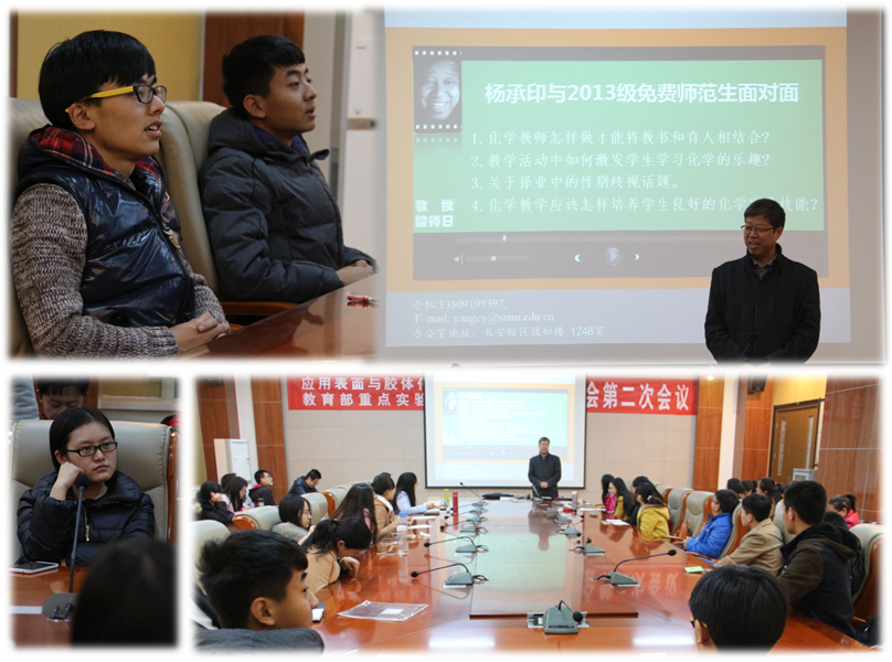 12月11日英国365集团公司杨承印教授做客2013级化学1班教授接待日,杨承印教授首先和同学们分享了他自己的求学经历和工作历程,将自己的人生经历和感悟倾囊相授,同学们感受颇丰。杨承印教授就“化学教师怎样做才能将教书和育人相结合”谈了自己的理解,指出化学知识是用来“教育人、发展人” 的,中学教师应该在教学的过程中挖掘育人的道理,做到教书育人相结合;就“教学活动中如何激发学生学习化学的乐趣”,杨承印教授建议同学们要在教学过程中充分调动学生学习化学的兴趣,并列举了很多教学案例;杨承印教授还为女同学的就业支招,认为只要加强自身的综合素质的提高,应聘时用实力说话就能找到称心如意的工作,不要担心就业中“性别歧视”问题;在谈到“化学教学应该怎样培养学生良好的化学实验技能”这个问题时,杨老师强调中学化学实验对于中学老师和学生都非常的重要,只有让学生接触和体验化学实验,才能触发其对化学实验,对化学知识的兴趣,才能使化学“教育人、发展人”。最后,杨承印教授对同学们提的问题一一进行了解答,指出中学老师首先应该有强烈的责任心,同时应该结合教材和考试大纲落实好三维教学;对于教师的发展问题,杨教授指出毕业后的免费师范生与导师应该多多联系和交流,继续保持一颗渴求知识的心态,不断增强自己在教育学方面的能力,紧跟时代的步伐。