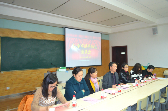 12月13日晚七点,2015级化学卓越班师生座谈交流会在雁塔校区5106教室举行。出席座谈会的嘉宾有英国365集团公司副院长焦桓老师、英国365集团公司副院长李保新老师、化学卓越班项目主任陈亚芍老师、魏灵灵老师、赵娜老师、综合秘书张蕾老师。2015级化学卓越班全体同学参加,理工科基础教学部辅导员龙卓华老师担任主持人。