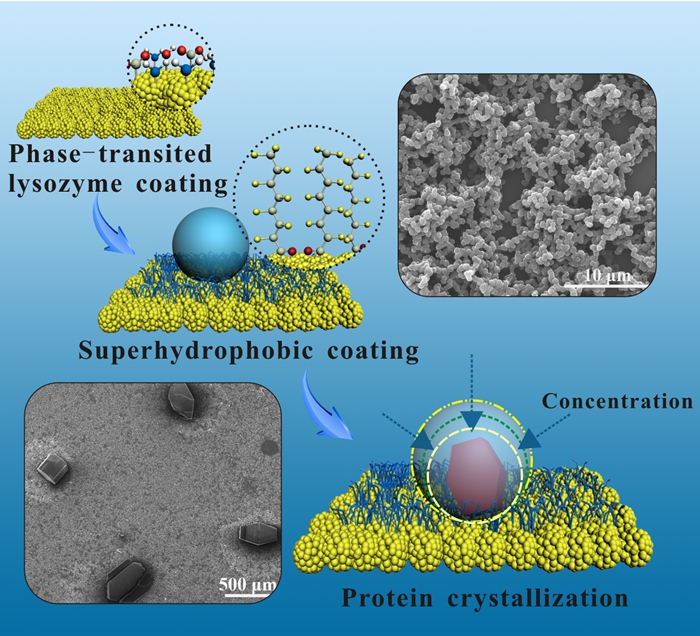 在上述工作的基础上,杨鹏课题组开发出基于溶菌酶相转变涂层的新型超疏水界面材料,并在此平台上简单高效地实现了蛋白质结晶这一具有极高难度和重要价值的工作(Adv. Mater.2015, DOI: 10.1002/adma.201504769)。超疏水表面由于具有特殊的润湿性能,在诸多领域都有潜在应用前景。然而由于传统方法在实用性上的局限性,开发新型超疏水材料及探索其新的应用仍是科学家们关注的热点与难点。蛋白质结晶是获取蛋白质分子三维结构信息、理解其功能及分子作用机理的有效手段。然而,顺利实现蛋白质结晶具有非常大的难度和挑战性,经常需要长的结晶时间、高的盐浓度以及剧毒结晶诱导剂的使用。因此,如何容易的获得高质量蛋白质晶体是分析生物大分子的结构、进行药物设计和生化研究的瓶颈技术之一。杨鹏课题组巧妙地将上述两个难点合二为一,用基于溶菌酶的蛋白质基超疏水表面成功实现了便捷、高效的蛋白质结晶新技术,不仅为超疏水表面的制备开辟了新的实用方法,同时为蛋白质结晶提供了新的思路。相关论文发表在最新的Advanced Materials上,并被遴选为Advance in Advances (即VIP论文)。在这一研究中,他们通过操控溶菌酶的相转变过程,在各种基材表面形成了具有微纳米尺寸的多孔结构涂层。通过简单的疏水分子修饰,涂层表面就能展现出稳定的超疏水特性。该技术温和环保,可在任意基材表面(如金属、聚合物、无机物等)构筑超疏水涂层。同时,其具有良好的热稳定性和机械稳定性,在-196到200℃的冷热刺激以及胶带撕拉下仍可稳固粘附在基材表面并保持超疏水特性。他们发现在该疏水表面上,通过控制水滴的蒸发过程可实现对水滴的汇聚浓缩。该效应可以在无添加剂、超低浓度(微摩尔量级)以及短时间(几小时)下高效诱导蛋白质晶体的形成。同时,将蛋白质点样技术与蛋白质结晶结合起来,可以在超疏水表面快速获得大规模的晶体阵列。该技术为蛋白质晶体的结晶条件快速排查以及晶体制备提供了一种新方法,在生物医药、结构生物学、光电子学以及表面改性等领域有着巨大的应用价值和前景。