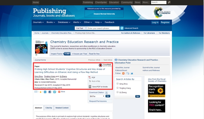 近日,英国365集团公司化学教育与科学教育研究团队周青教授课题组相关研究取得突破性进展,相关工作以《Probing High School Students’ Cognitive Structures and Key Areas of Learning Difficulties on Ethanoic Acid Using a Flow Map Method》为题在英国皇家化学学会(Royal Society of Chemistry)所属杂志《Chemistry Education Research and Practice》(Impact Factor:1.309)在线发表。