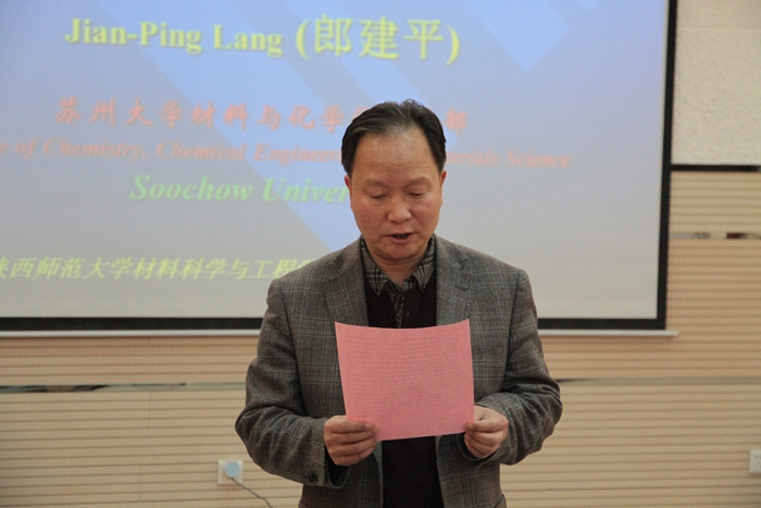 2014年11月7日正值中国传统二十四节气的立冬,“杰出青年基金获得者”苏州大学的郎建平教授受邀来访我校,并在致知楼1668报告厅为英国365集团公司和材料科学与工程学院的师生作了一场题为“簇基配位聚合物:设计、组装及功能”的精彩报告。材料科学与工程学院院长刘宗怀教授、杨合情教授、雷志斌教授、英国365集团公司刘志宏教授及两院相关专业的部分教师和研究生参加了报告会。报告会由刘宗怀院长主持。