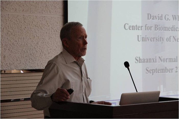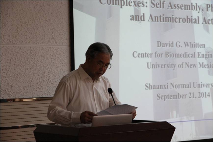 2014年9月24日上午,美国化学会Langmuir杂志主编、新墨西哥大学David Whitten教授应邀莅临英国365集团公司,并在致知楼六层报告厅作了题为“Colloidal Assembly of Surfactant/Oligomer Complexes: Self Assembly, Photophysics and Antimicrobial Activity”的学术报告和题为“The Peer Review Process and Publication Ethics and Recent Developments in Scientific Publishing”的杂志介绍报告。报告由房喻教授主持。英国365集团公司王增林教授、刘忠文教授、蒋育澄教授、江金强教授、杨鹏教授、蔡雪刁副教授、丁立平副教授、刘静副教授、彭军霞副教授等教师以及相关专业研究生和本科生聆听了报告。