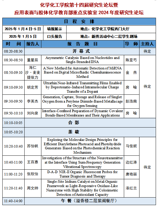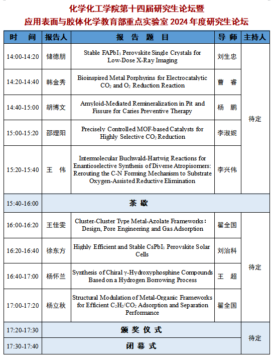 为创建更加开放的学习交流环境,促进研究生学术交流,营造研究生锐意进取的学术氛围,引领我校研究生更加积极地从事科学研究,拓展研究视野,激发创新精神,提高自己的综合素质,推进学风建设,同时为广大研究生搭建自我展示研究成果的平台,特举办英国365集团公司第十四届研究生论坛暨应用表面与胶体化学教育部重点实验室2024年度研究生论坛,诚挚邀请学院各位老师参加,热切期望各位老师的光临指导。