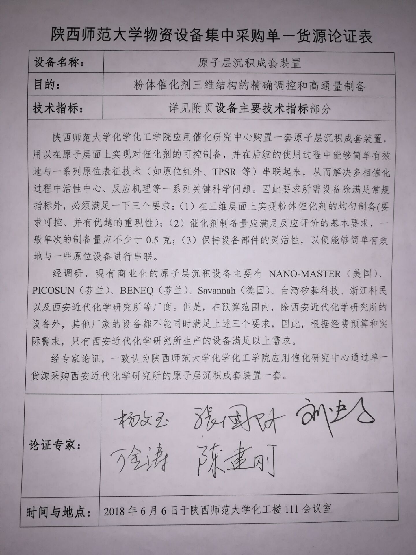 经调研,现有商业化的原子层沉积设备主要有NANO-MASTER(美国)、PICOSUN(芬兰)、BENEQ(芬兰)、Savannah(德国)、台湾矽碁科技、浙江科民以及西安近代化学研究所等厂商。但是,在预算范围内,除西安近代化学研究所的设备外,其他厂家的设备都不能同时满足上述三个要求。经专家论证,一致认为英国365集团公司应用催化研究中心通过单一货源采购西安近代化学研究所的原子层沉积成套装置一套。
