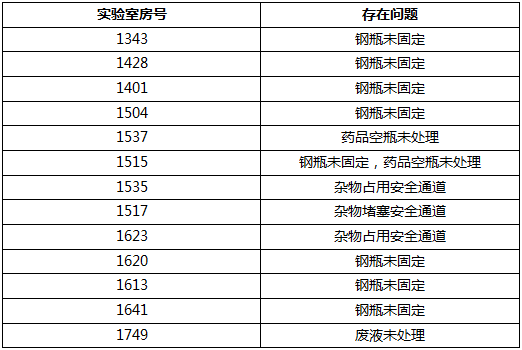 截止10月15日下午,仍有部分实验室对于存在的安全隐患未进行整改。现将相关情况通报如下: