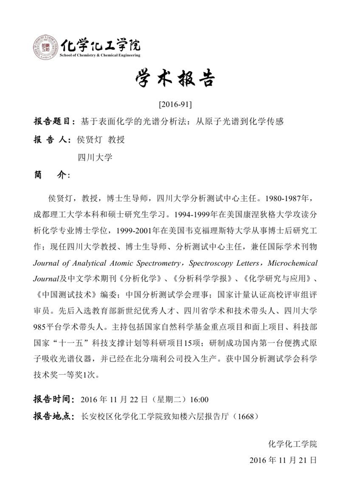 侯贤灯教授学术报告预告[2016-91]