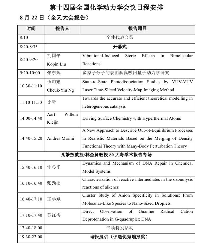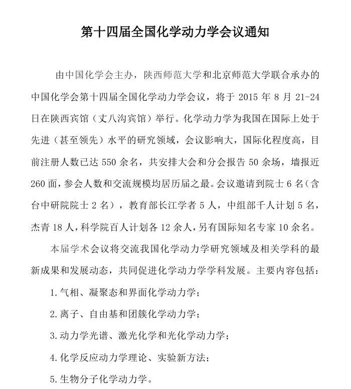 第十四届全国化学动力学会议通知