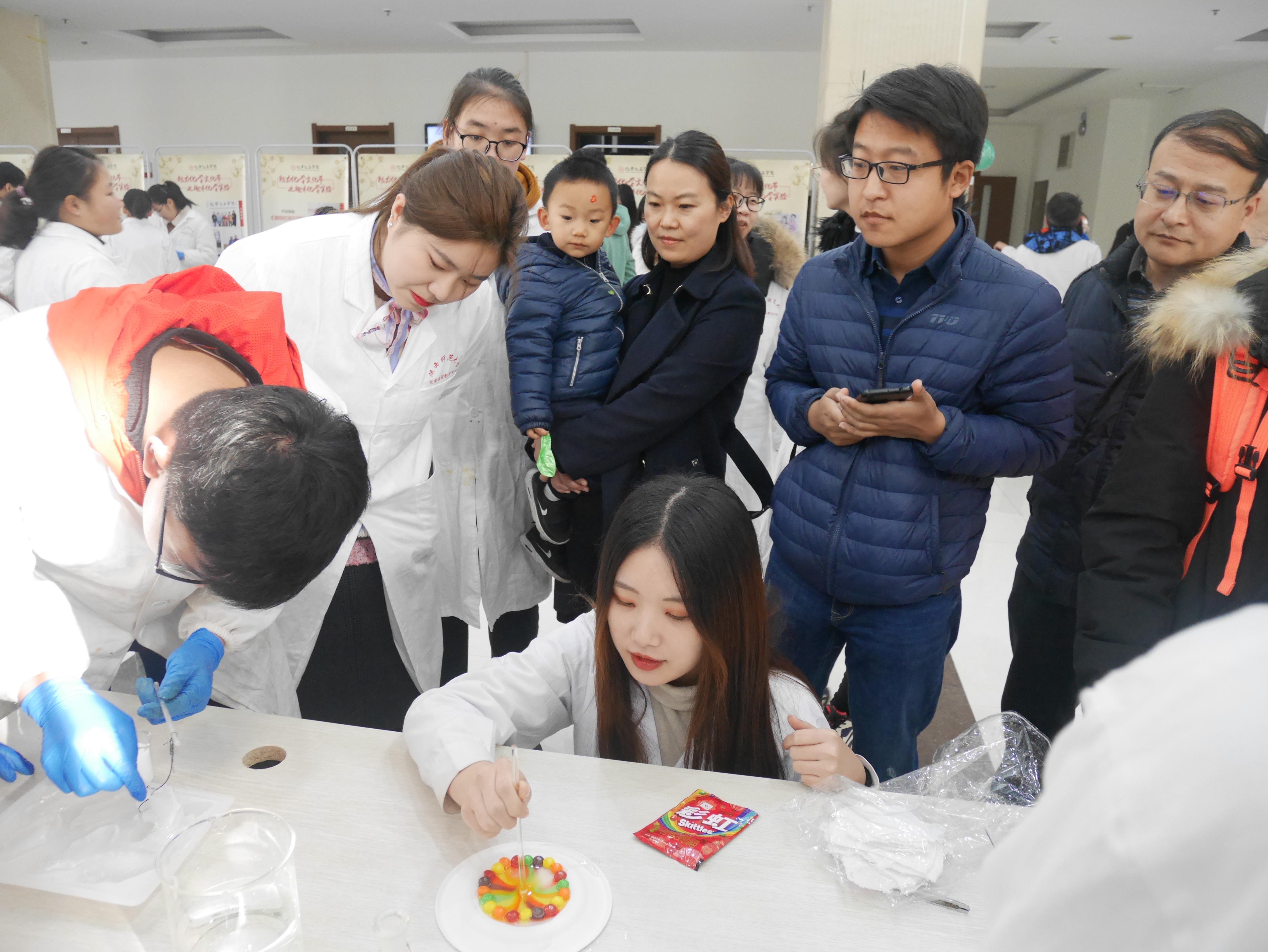 活动开始后,各个团队“各显神通”,尤其是汽水灯笼团队,操作简单,造型别致,寓意深远,以其独特的趣味性和精彩讲述深受评委和观众的喜爱。其他团队也不堪示弱,烧不坏的防火布在酒精灯上自在跳跃,五彩缤纷的彩虹糖展现着色彩的魔力,俏皮的小冰鱼被牵引着上钩,模拟溶洞带人走进一个奇幻的溶洞世界,红绿灯的色彩变换让人啧啧称奇......活动吸引了许多观众驻足,并收到了大量好评。此外,互动答题抽奖区也十分热闹,观众们参与度极高,在提升化学常识的过程中,还获得了精美的礼品。