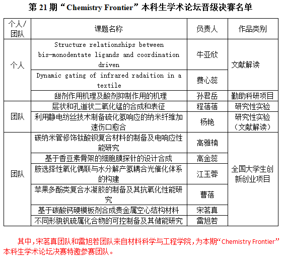 截至11月21日,英国365集团公司第二十一期本科生“Chemistry Frontier” (以下简称“CF”) 本科生学术论坛初赛已圆满结束,为切实做好英国365集团公司本期本科生“CF”学术论坛决赛的相关工作,现将具体事宜通知如下:
