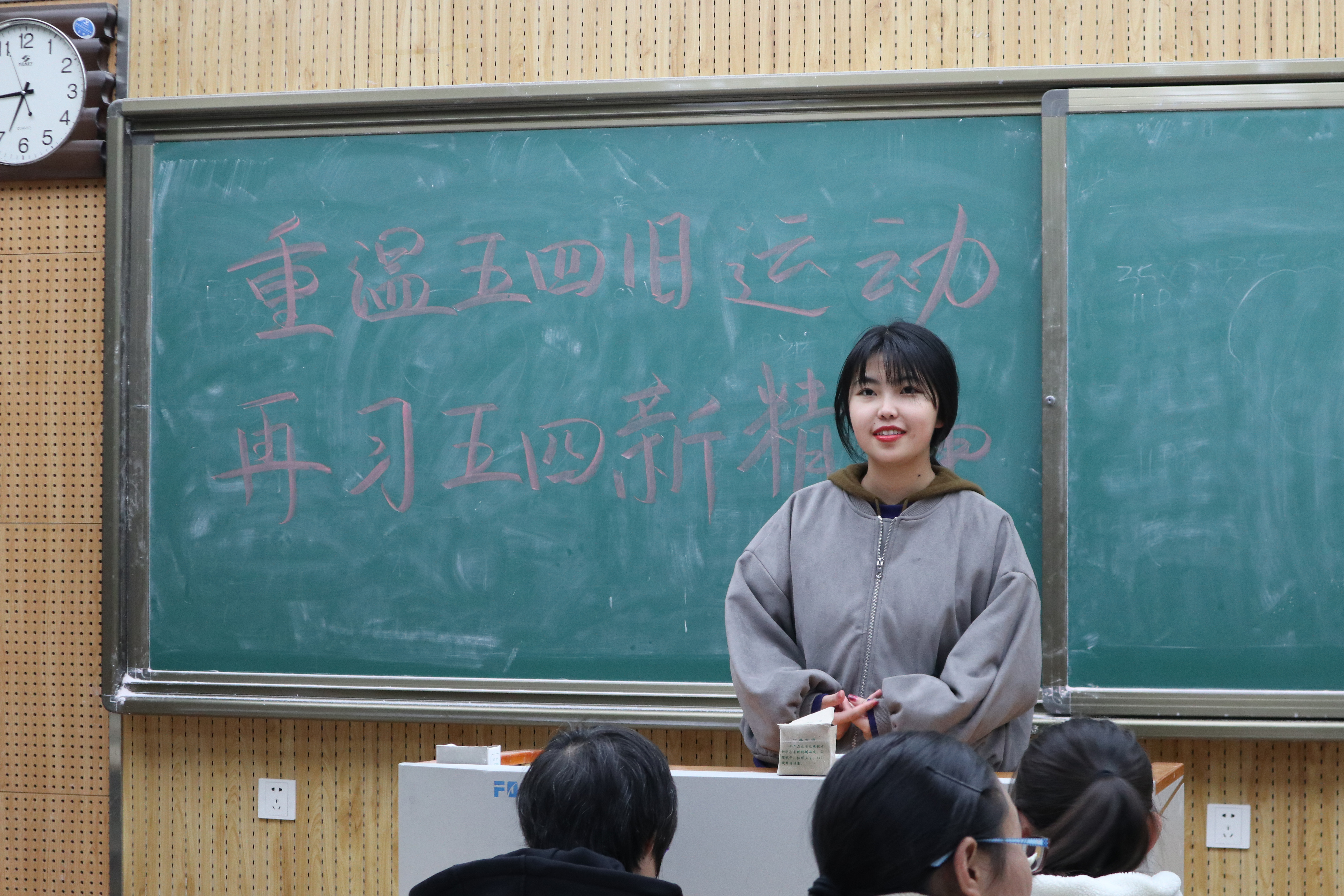 首先,八名同学通过声情并茂的演讲,从五四运动的历史背景出发,向同学们介绍五四运动,并展示自己对于五四运动的见解和对于五四精神的阐释。同学们的演讲感染着在场每一位热血青年的心。在点评阶段,同学们纷纷发表看法。在击鼓传花小活动后,几位同学高唱红歌。同学们积极参与,教室气氛活跃。最后全体同学一起观看关于习近平总书记在纪念五四运动重要讲话精神的视频,看完习近平总书记讲话后,同学们掌声热烈。