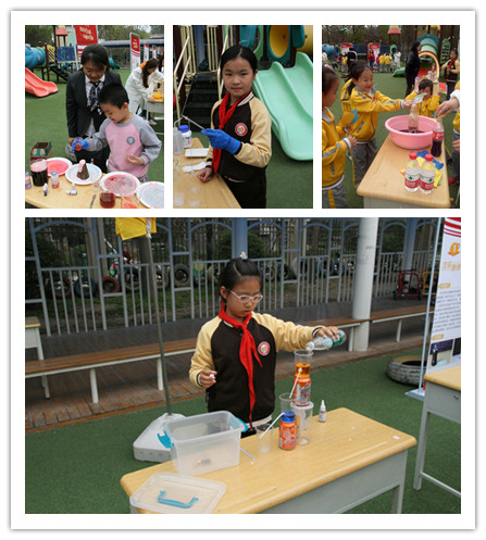 下午14:30,一至五年级的同学们在老师的带领下,按照年级从低到高的顺序依次进入展区进行参观。大操场的展区共分为三块,分别是:科幻画展区、智能组合大比拼和科学奥秘体验区,而科学奥秘体验区正是由来自英国365集团公司的十七个团队的趣味化学实验展所组成。考虑到小朋友们的理解能力,此次选取的展示实验均是由贴近生活的实验原理和明显且常见的实验现象构成,操作便捷,装置简单,旨在帮助同学们感受实验的过程。