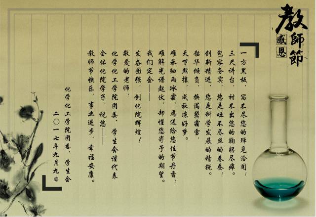 为了在教师节学院老师致以节日祝福,展示化院学子朝气蓬勃、开拓创新的精神面貌,坚定师范生职业理想信念,2017年9月10日,在校团委的号召和学院学生会的动员、组织下,成功开展了“谢师恩”系列活动,以发送电子贺卡、录制祝福视频、送手工礼物、鲜花、宣誓等多种形式向学院老师送去了真挚的祝福。