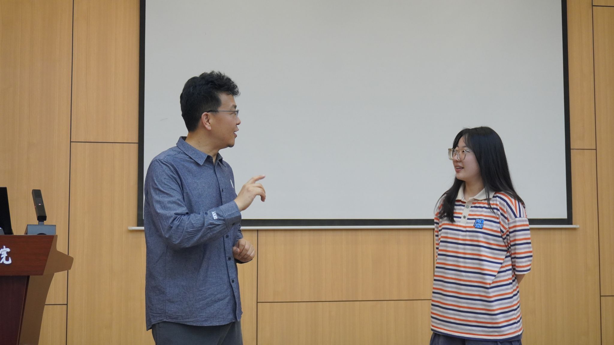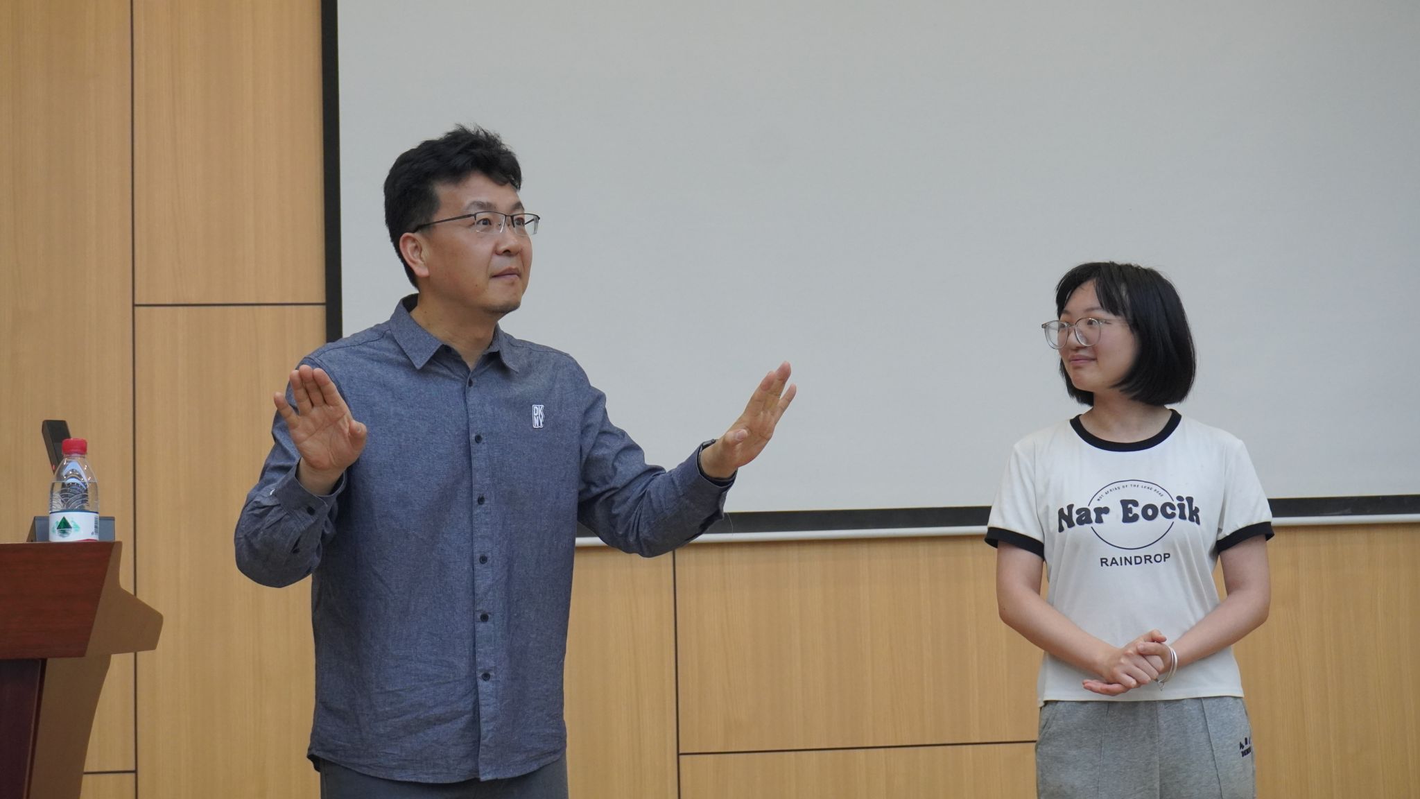 报告中,何明家老师请现场几位同学自我介绍、模拟上课、交谈等形式,让同学发现自己存在的问题,并对几位同学的表现做了现场点评和针对性指导。何老师指出,每个人的嗓音是独一无二、不可替代的,同学们要将自身的声线与个人特色相结合。