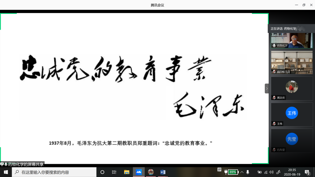 6月19日,应化教法高分子支部牵手云端,利用腾讯会议召开了“迎七一” 专题组织生活会。组织生活会上,陈建刚书记围绕课程思政,展望了未来结合课程教学建设课程思政的一些规划。严文法委员结合《高等学校课程思政建设指导纲要》,认为课程与思政的结合是落实立德树人根本任务的具体措施,回答了培养什么人、为谁培养人、怎么培养人的问题,习近平总书记指出,好的思想政治工作应该像盐,但不能光吃盐,最好的方式是将盐溶解到各种食物中自然而然地吸收。课程教学不能是单纯知识与技能的传授,还要渗透学科所能承载的正确的价值观念和必备品格。支部其他同志也纷纷就课程思政与学科教学的结合讨论了自己的具体操作与未来的改进措施。